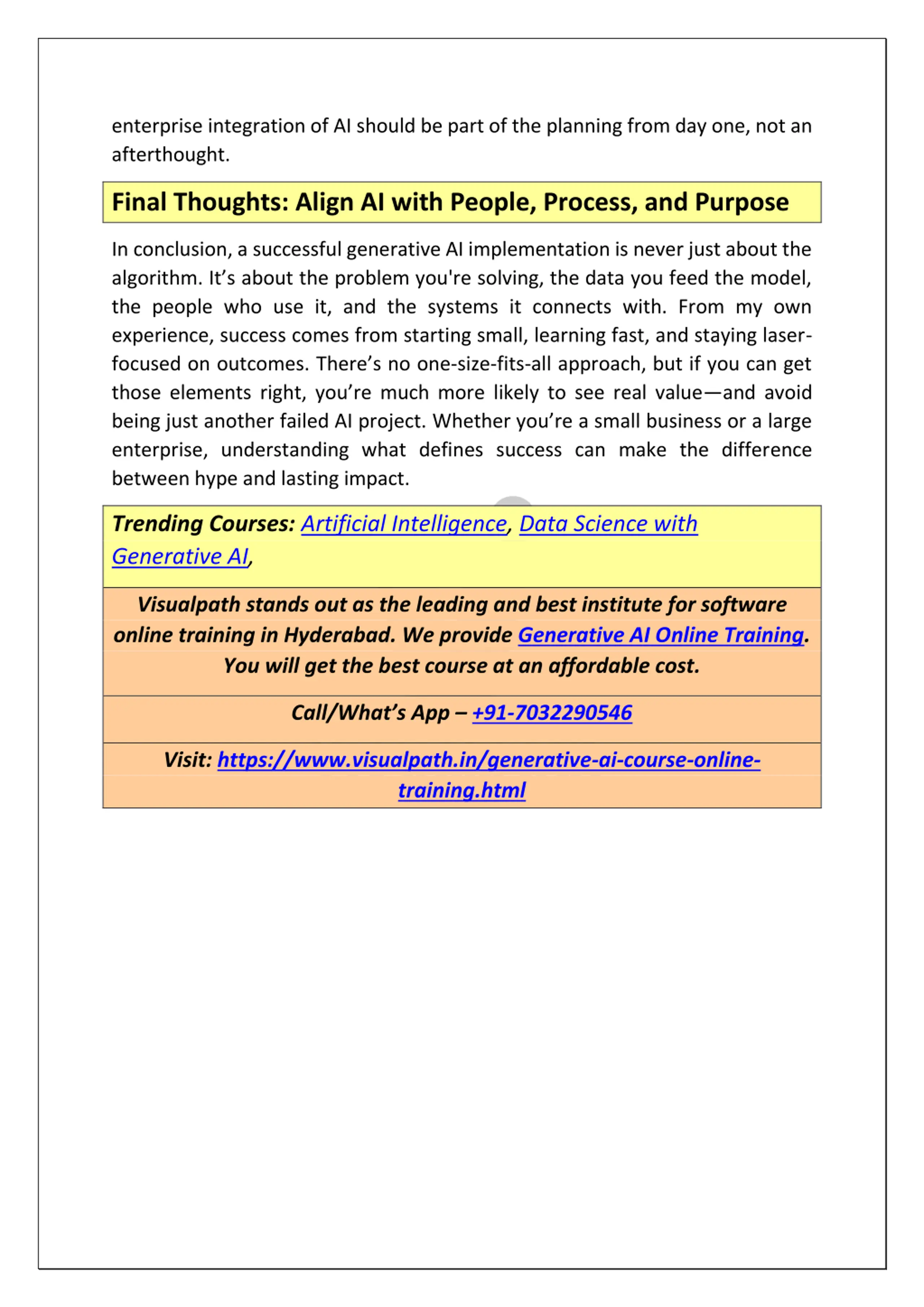 enterprise integration of AI should be part of the planning from day one, not an afterthought. Final Thoughts: Align AI with People, Process, and Purpose In conclusion, a successful generative AI implementation is never just about the algorithm. It s about the problem you're solving, the data you feed the model, the people who use it, and the systems it connects with. From my own experience, success comes from starting small, learning fast, and staying laser- focused on outcomes. There s no one-size-fits-all approach, but if you can get those elements right, you re much more likely to see real value and avoid being just another failed AI project. Whether you re a small business or a large enterprise, understanding what defines success can make the difference between hype and lasting impact. Trending Courses: Artificial Intelligence, Data Science with Generative AI, Visualpath stands out as the leading and best institute for software online training in Hyderabad. We provide Generative AI Online Training. You will get the best course at an affordable cost. Call/What s App +91-7032290546 Visit: https://www.visualpath.in/generative-ai-course-online- training.html