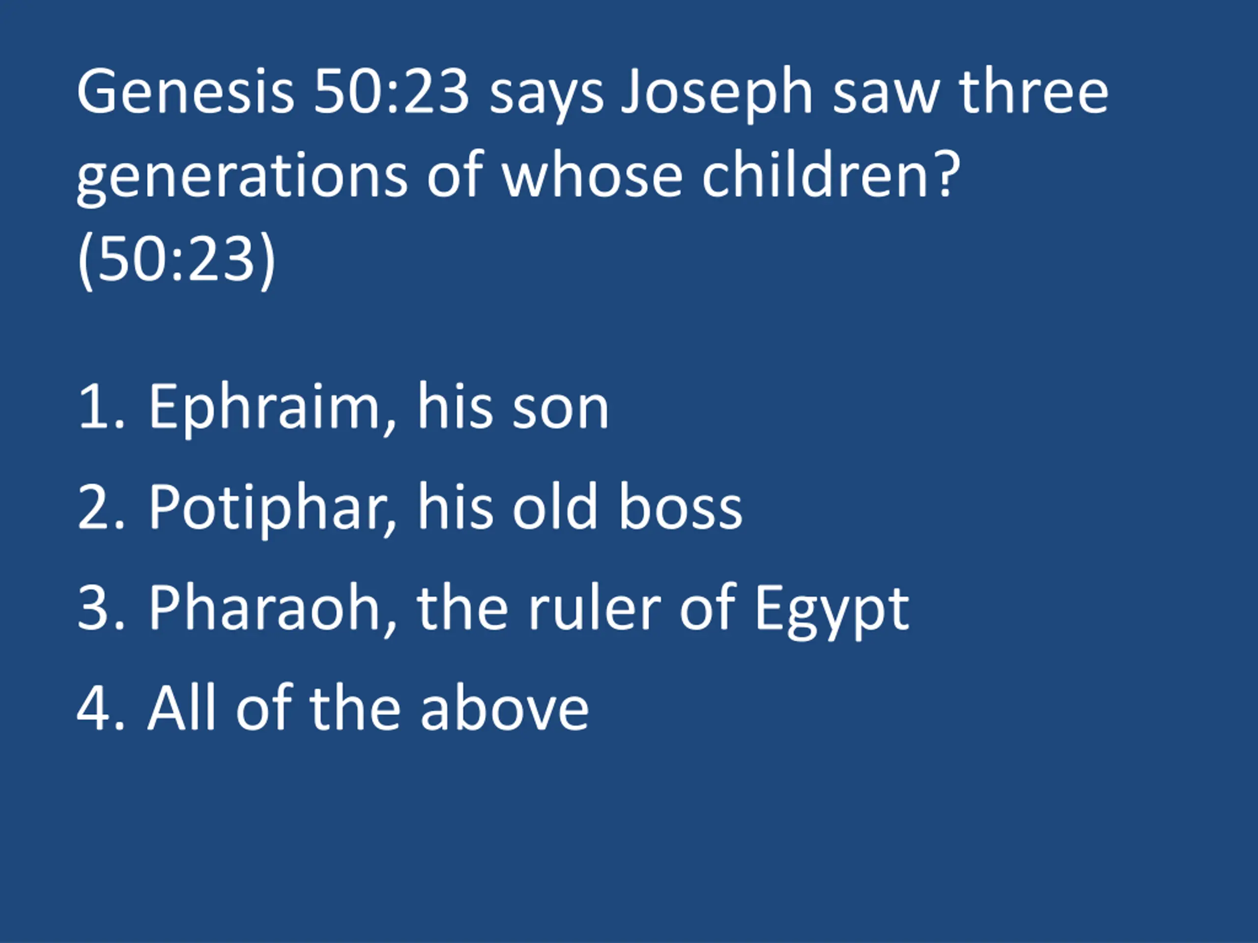Genesis 50:23 says Joseph saw three generations of whose children? (50:23) 1. Ephraim, his son 2. Potiphar, his old boss 3. Pharaoh, the ruler of Egypt 4. All of the above