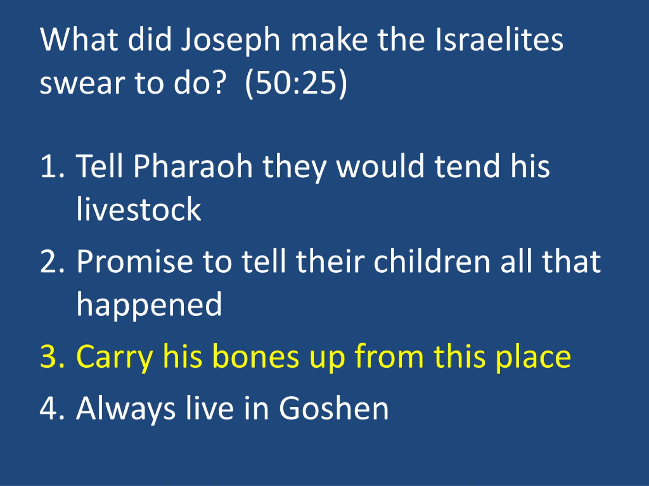 What did Joseph make the Israelites swear to do? (50:25) 1. Tell Pharaoh they would tend his livestock 2. Promise to tell their children all that happened 3. Carry his bones up from this place 4. Always live in Goshen
