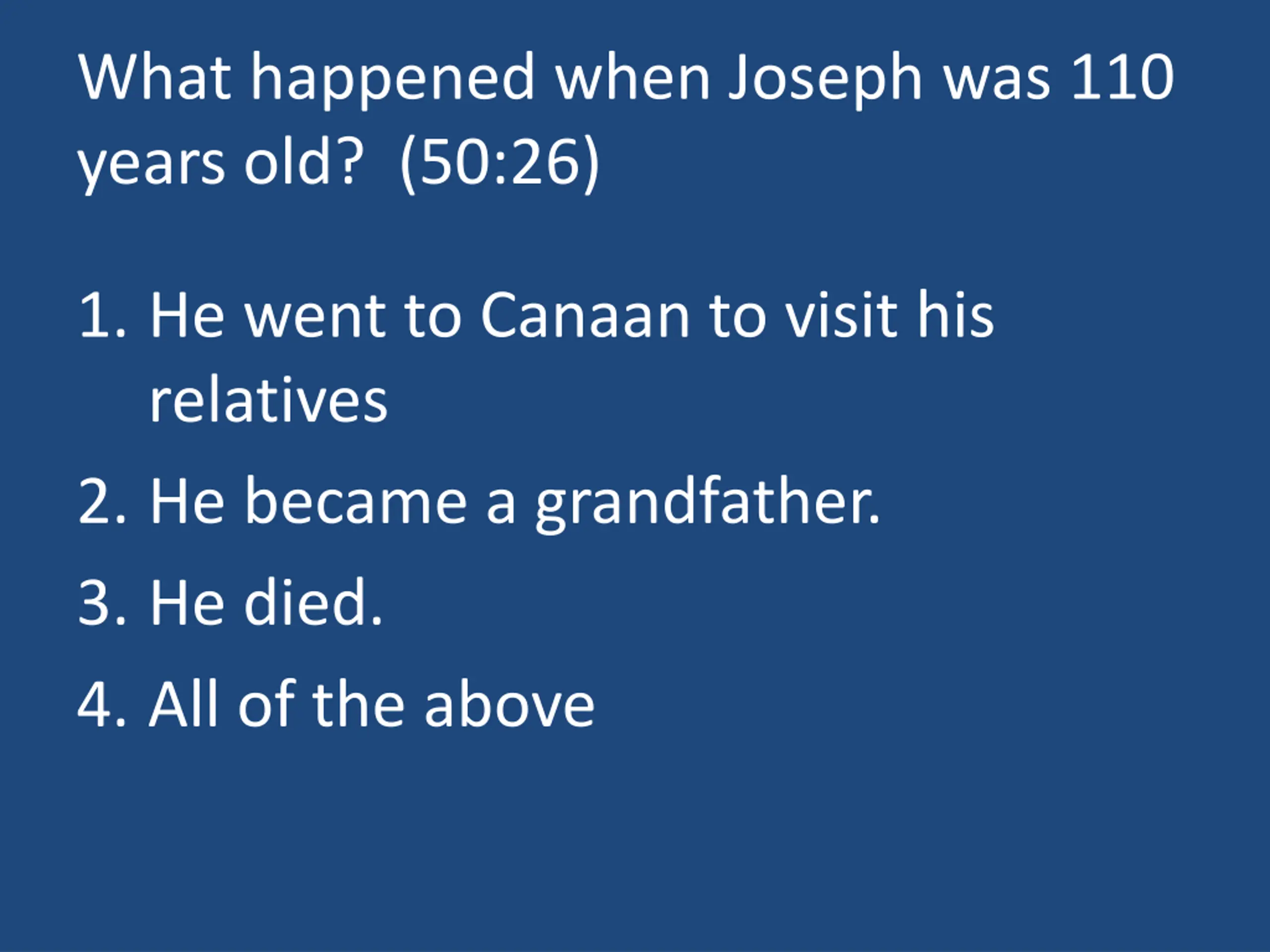 What happened when Joseph was 110 years old? (50:26) 1. He went to Canaan to visit his relatives 2. He became a grandfather. 3. He died. 4. All of the above
