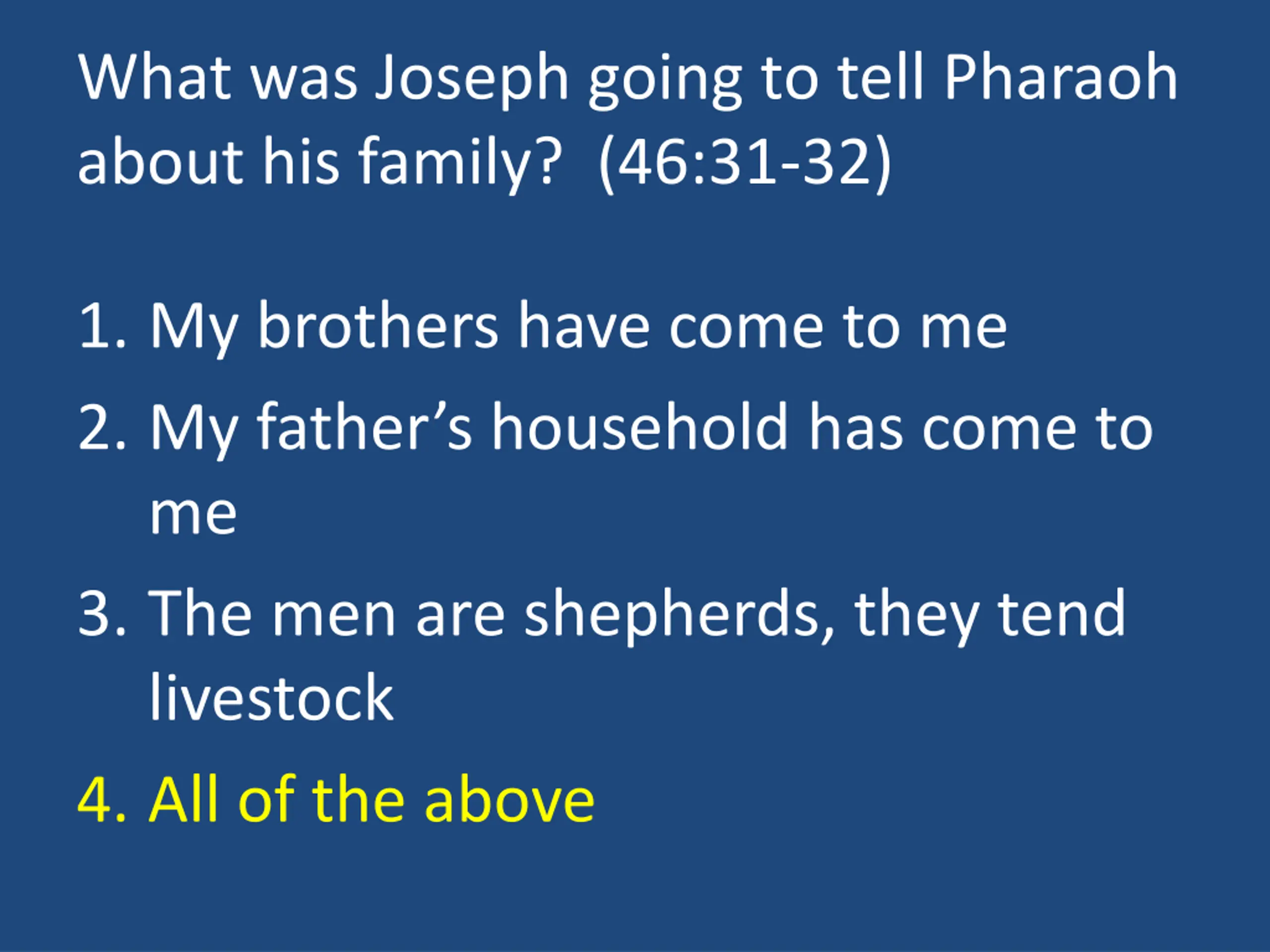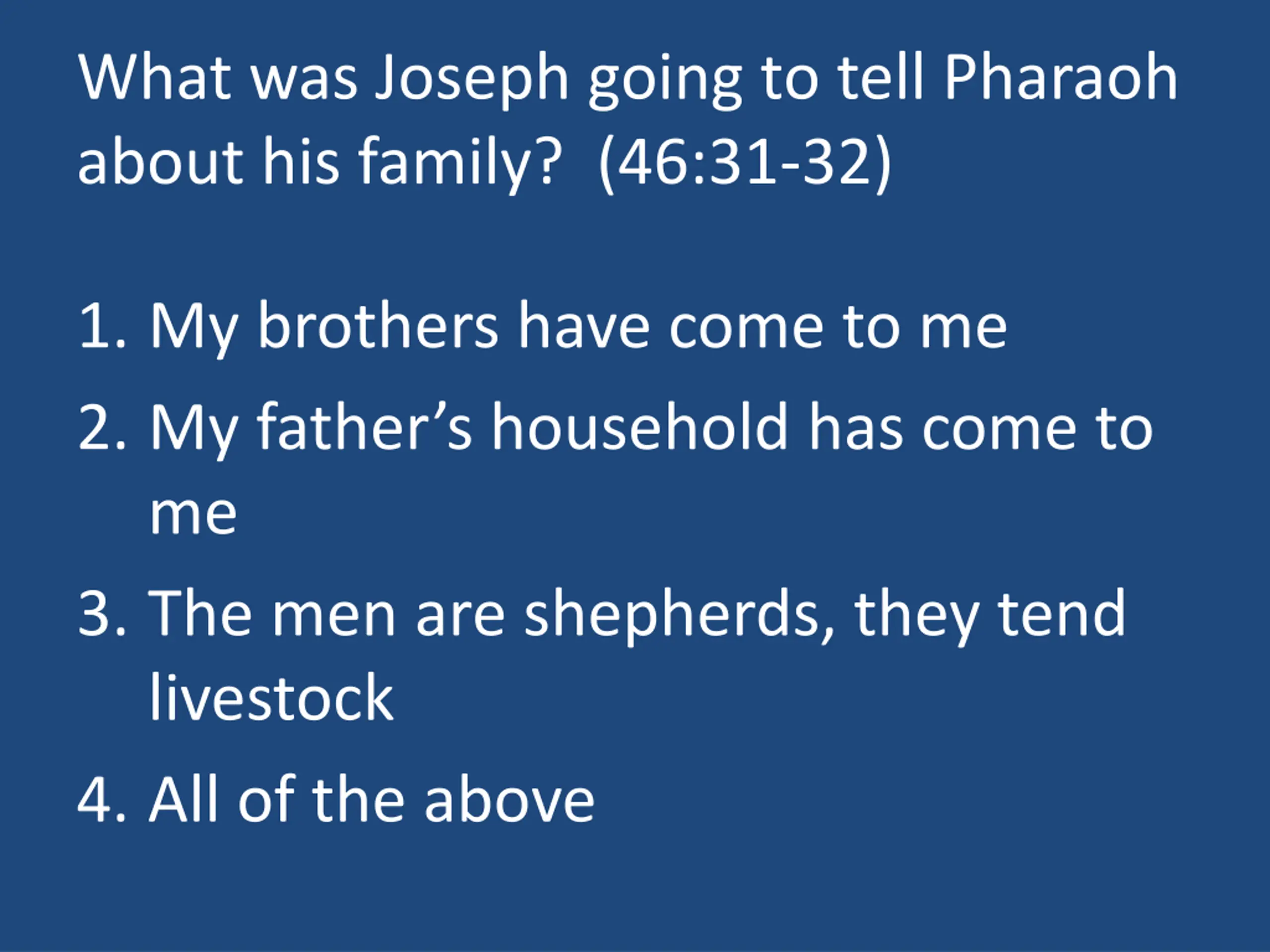 What was Joseph going to tell Pharaoh about his family? (46:31-32) 1. My brothers have come to me 2. My father s household has come to me 3. The men are shepherds, they tend livestock 4. All of the above