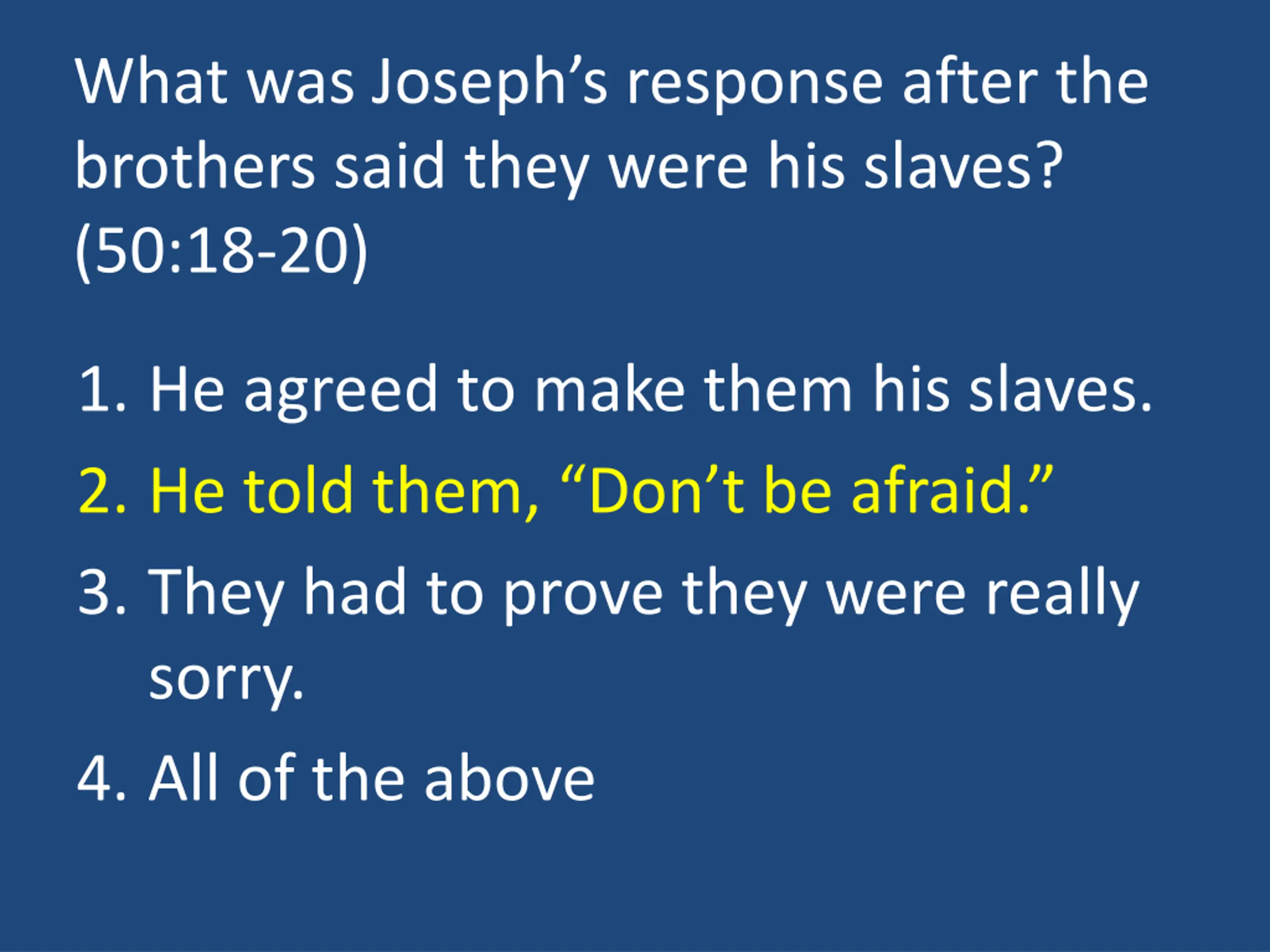 What was Josephs response after the brothers said they were his slaves? (50:18-20) 1. He agreed to make them his slaves. 2. He told them, Don t be afraid. 3. They had to prove they were really sorry. 4. All of the above