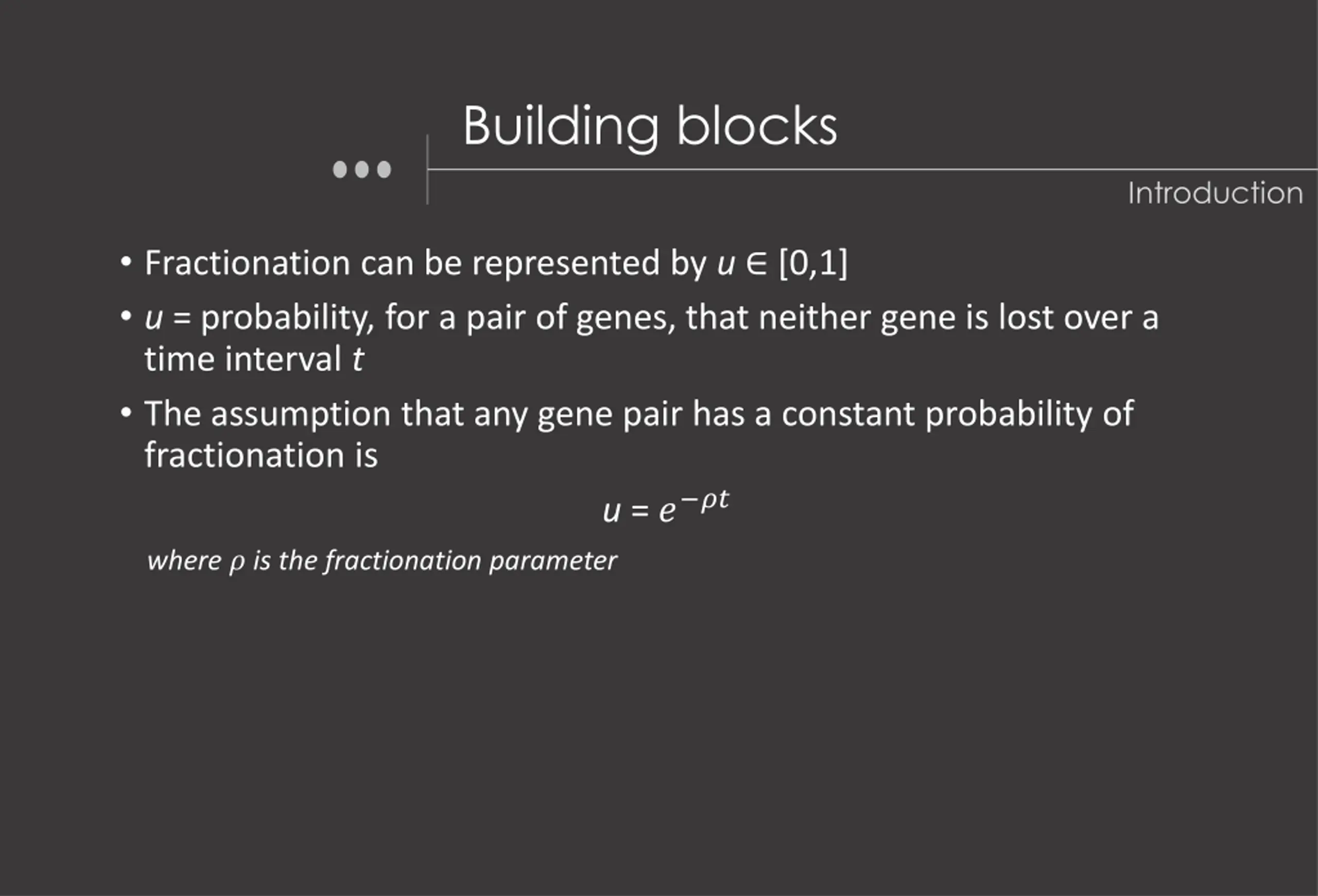 Building blocks Introduction Fractionation can be represented by u [0,1] u = probability, for a pair of genes, that neither gene is lost over a time interval t The assumption that any gene pair has a constant probability of fractionation is u = ? ?? where ? is the fractionation parameter