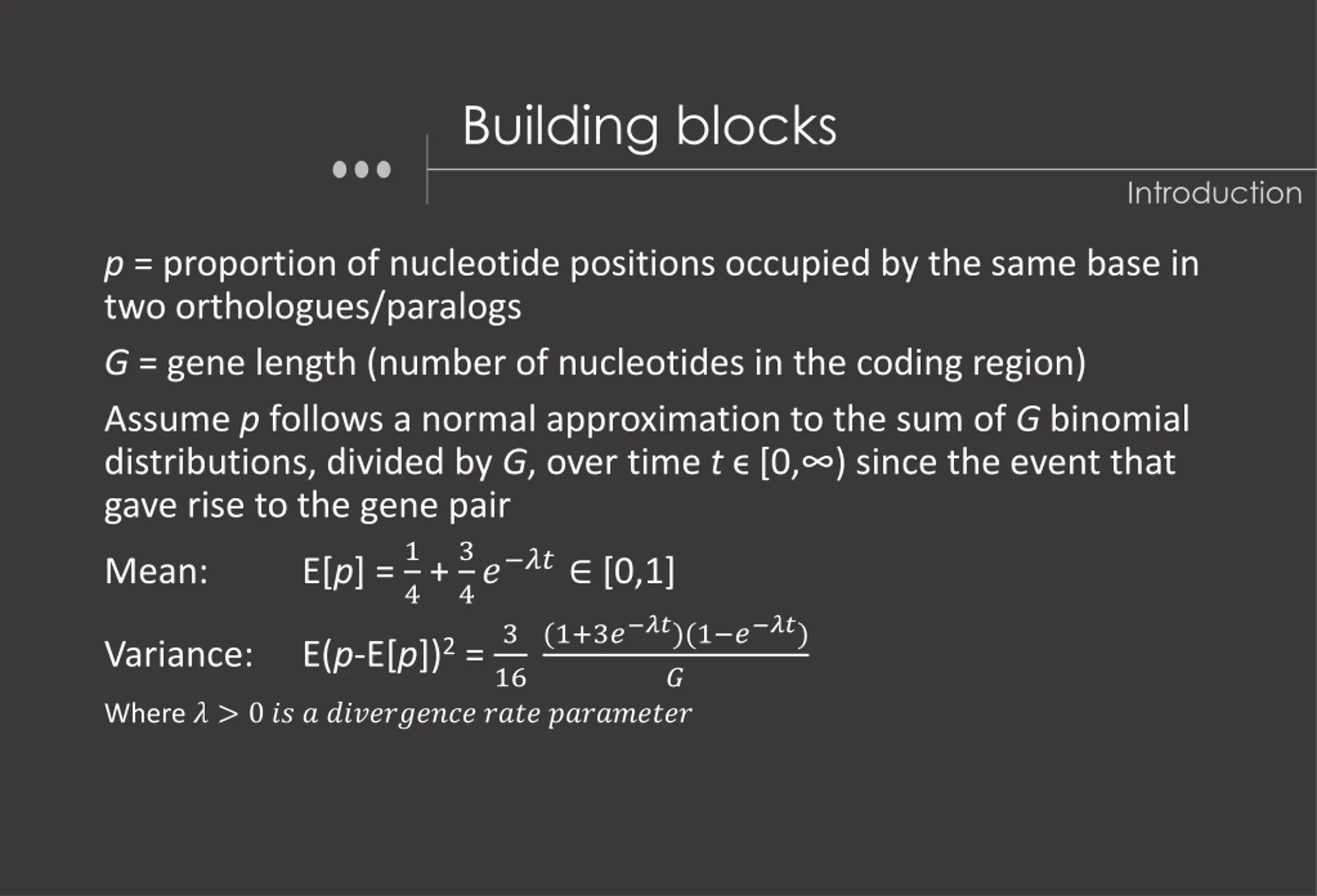 Building blocks Introduction p = proportion of nucleotide positions occupied by the same base in two orthologues/paralogs G = gene length (number of nucleotides in the coding region) Assume p follows a normal approximation to the sum of G binomial distributions, divided by G, over time t [0, ) since the event that gave rise to the gene pair E[p] = 1 4 + 3 4? ?? [0,1] (1+3? ??)(1 ? ??) Mean: E(p-E[p])2 = 3 Variance: 16 ? Where ? > 0 ?? ? ?????????? ???? ?????????