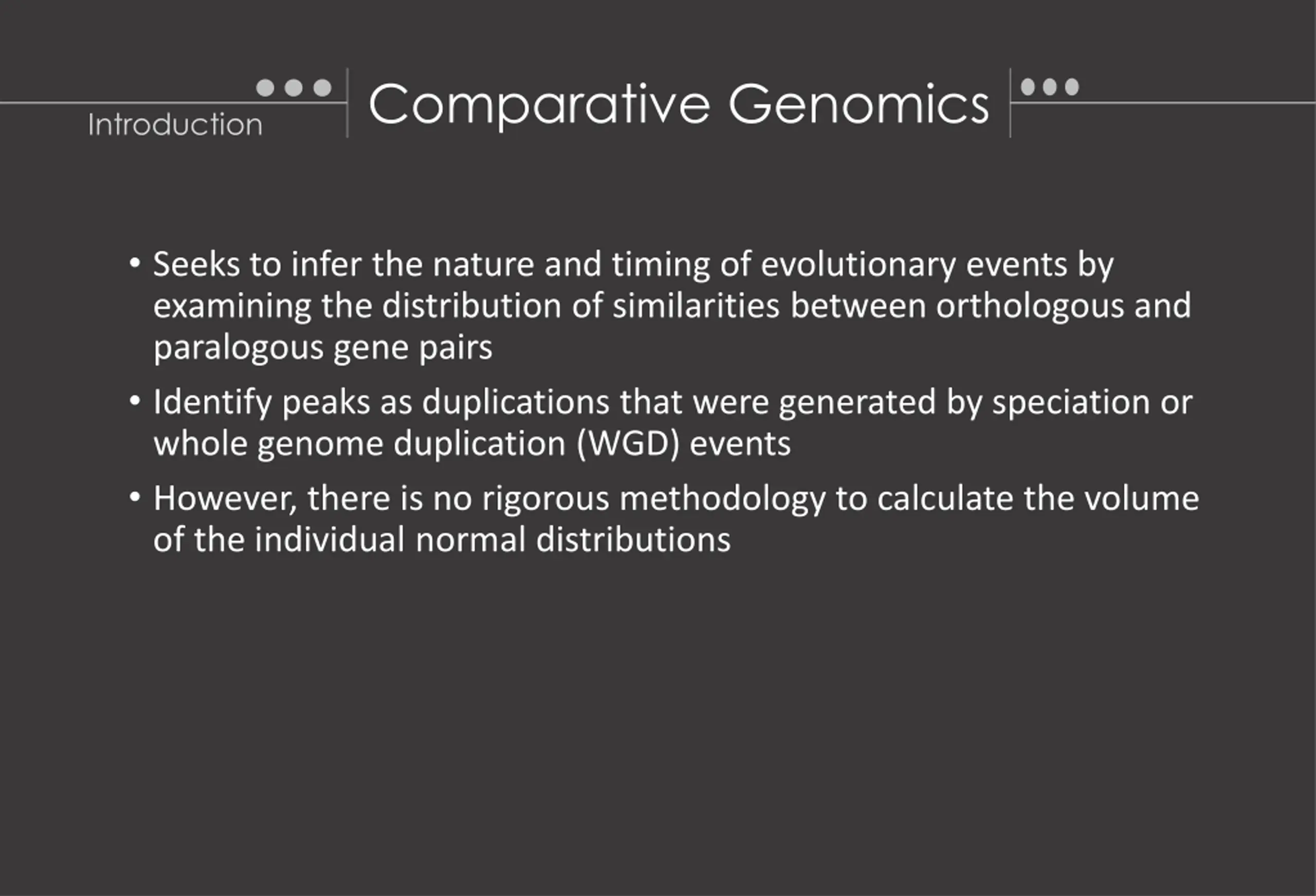 Comparative Genomics Introduction Seeks to infer the nature and timing of evolutionary events by examining the distribution of similarities between orthologous and paralogous gene pairs Identify peaks as duplications that were generated by speciation or whole genome duplication (WGD) events However, there is no rigorous methodology to calculate the volume of the individual normal distributions
