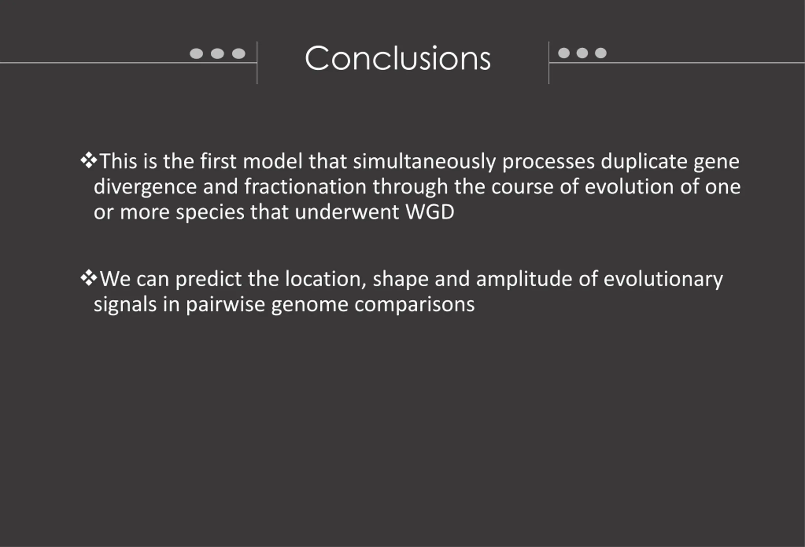 Conclusions This is the first model that simultaneously processes duplicate gene divergence and fractionation through the course of evolution of one or more species that underwent WGD We can predict the location, shape and amplitude of evolutionary signals in pairwise genome comparisons