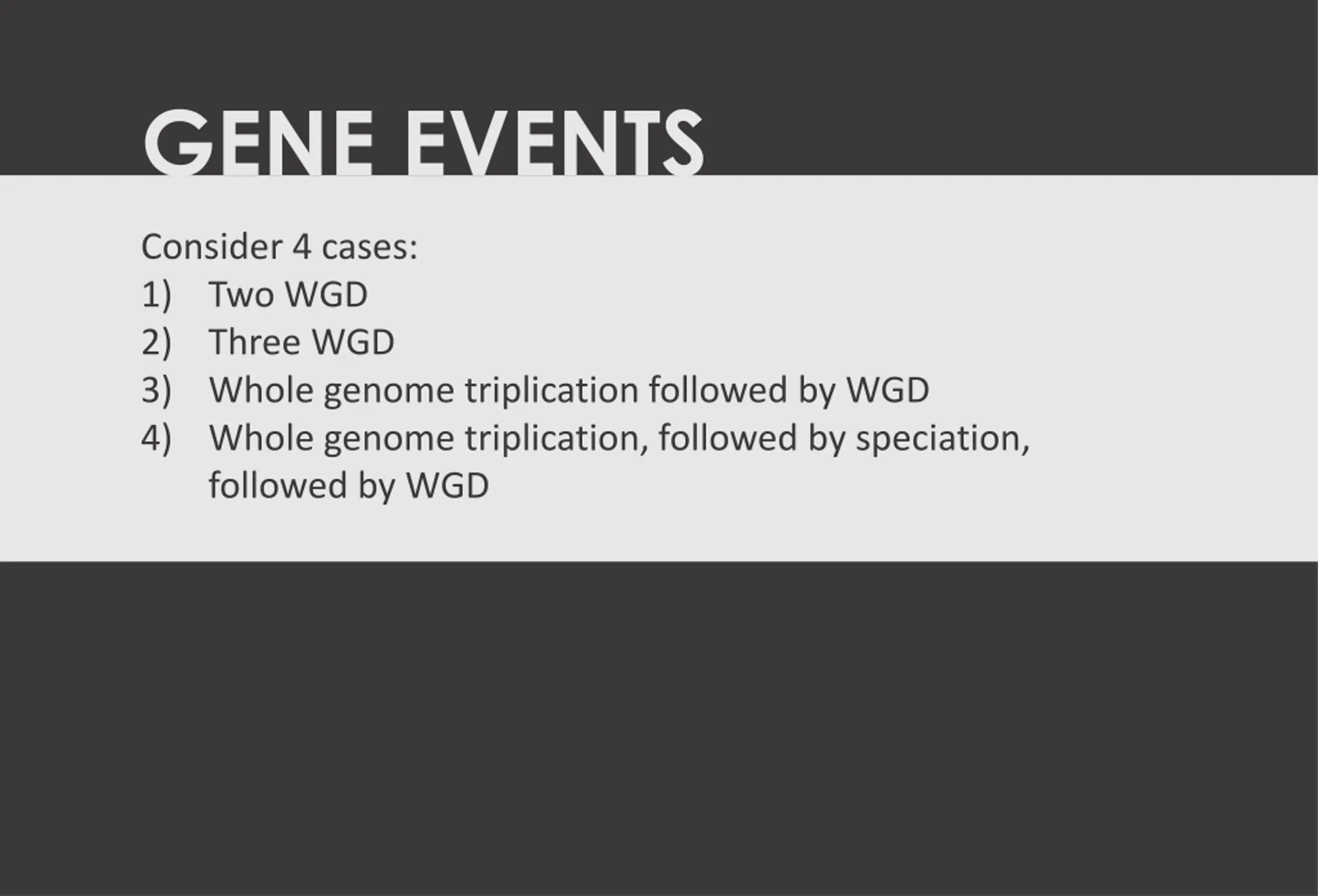 GENE EVENTS Consider 4 cases: 1) Two WGD 2) Three WGD 3) Whole genome triplication followed by WGD 4) Whole genome triplication, followed by speciation, followed by WGD