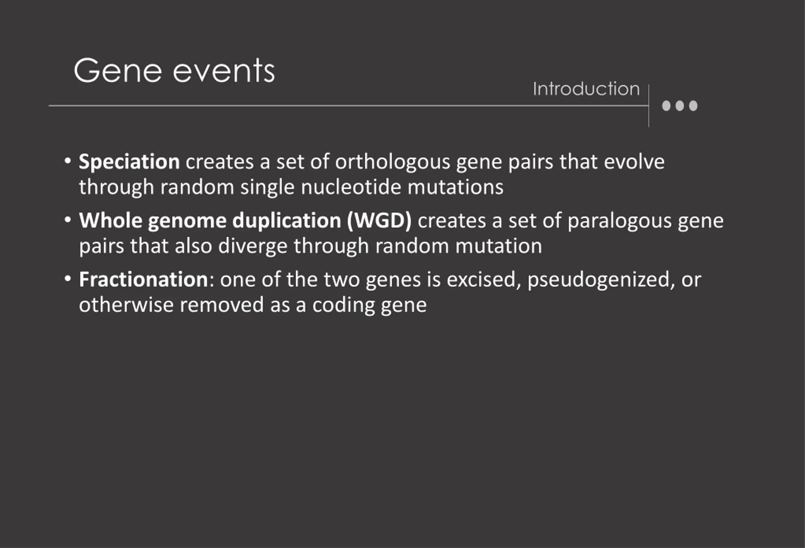 Gene events Introduction Speciation creates a set of orthologous gene pairs that evolve through random single nucleotide mutations Whole genome duplication (WGD) creates a set of paralogous gene pairs that also diverge through random mutation Fractionation: one of the two genes is excised, pseudogenized, or otherwise removed as a coding gene
