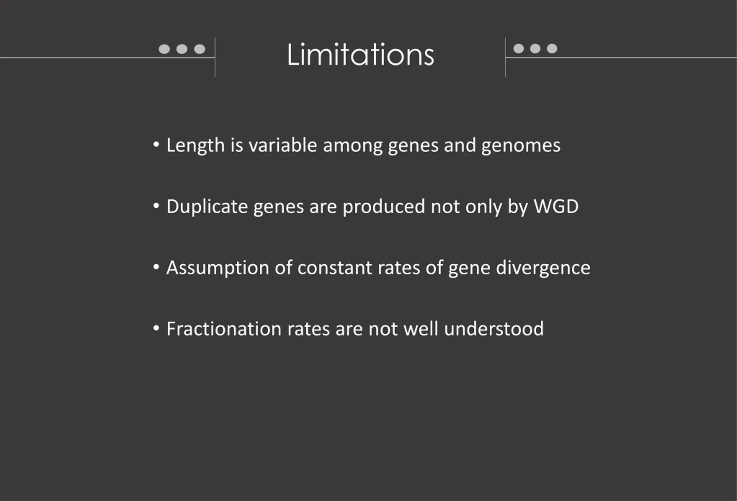 Limitations Length is variable among genes and genomes Duplicate genes are produced not only by WGD Assumption of constant rates of gene divergence Fractionation rates are not well understood