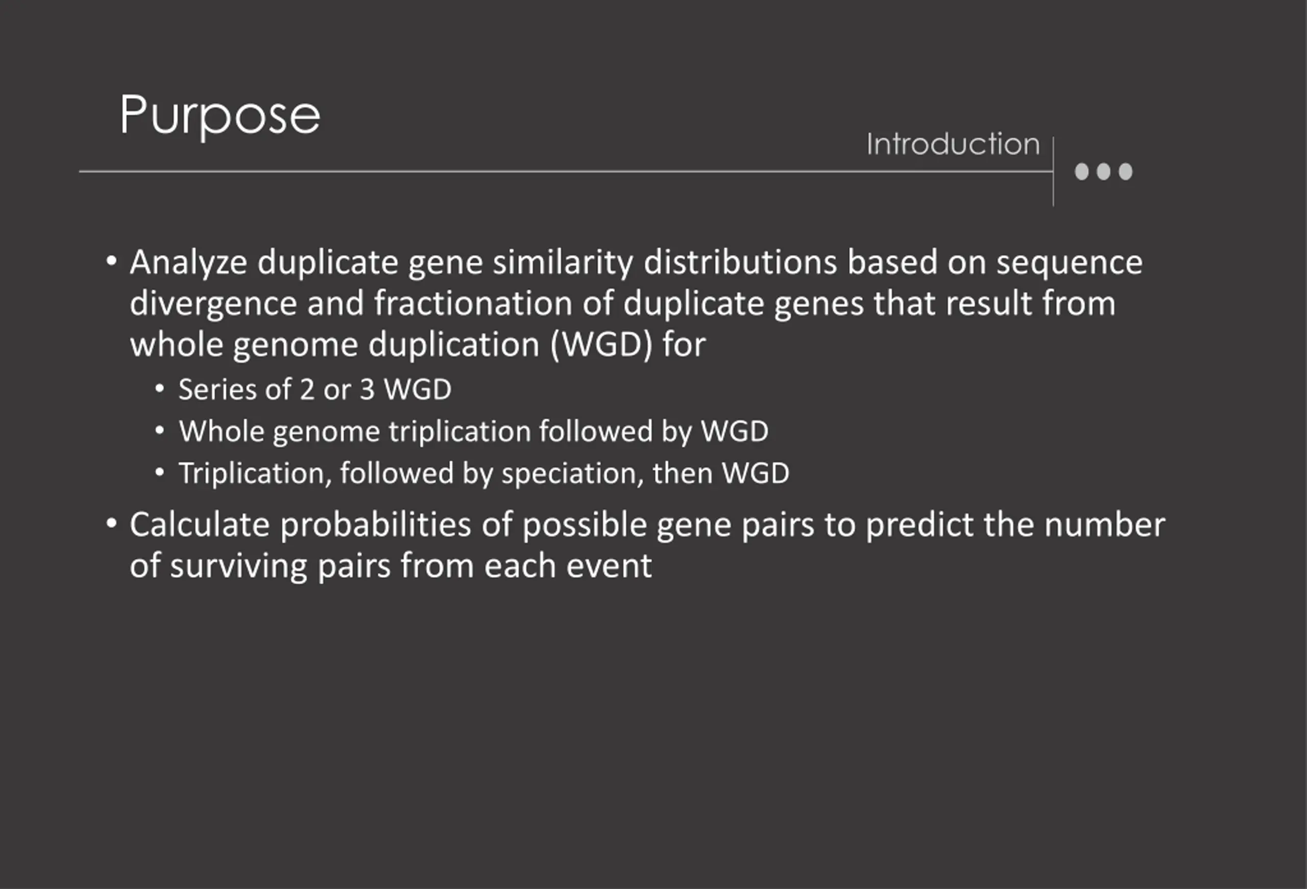 Purpose Introduction Analyze duplicate gene similarity distributions based on sequence divergence and fractionation of duplicate genes that result from whole genome duplication (WGD) for Series of 2 or 3 WGD Whole genome triplication followed by WGD Triplication, followed by speciation, then WGD Calculate probabilities of possible gene pairs to predict the number of surviving pairs from each event