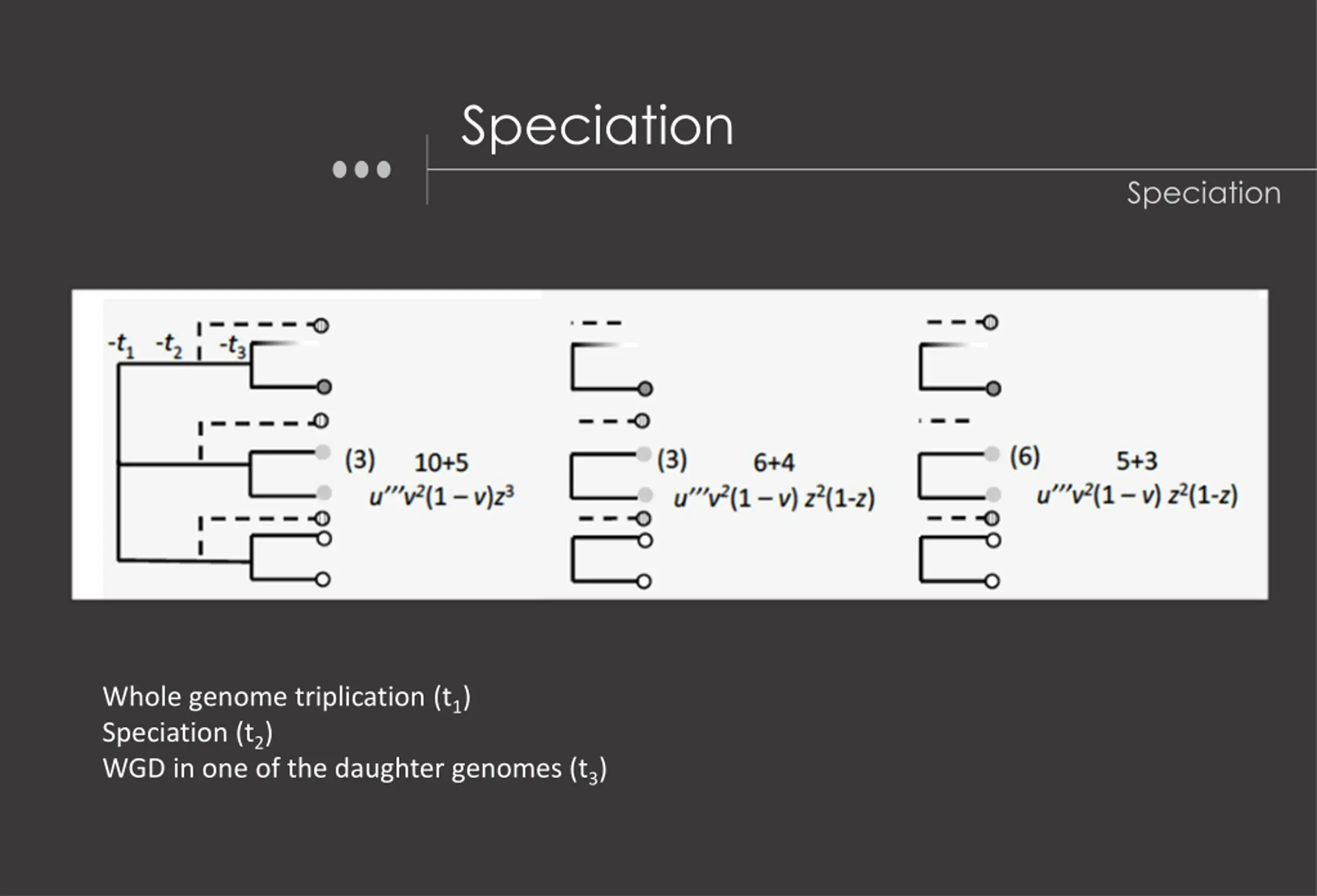Speciation Speciation Whole genome triplication (t1) Speciation (t2) WGD in one of the daughter genomes (t3)