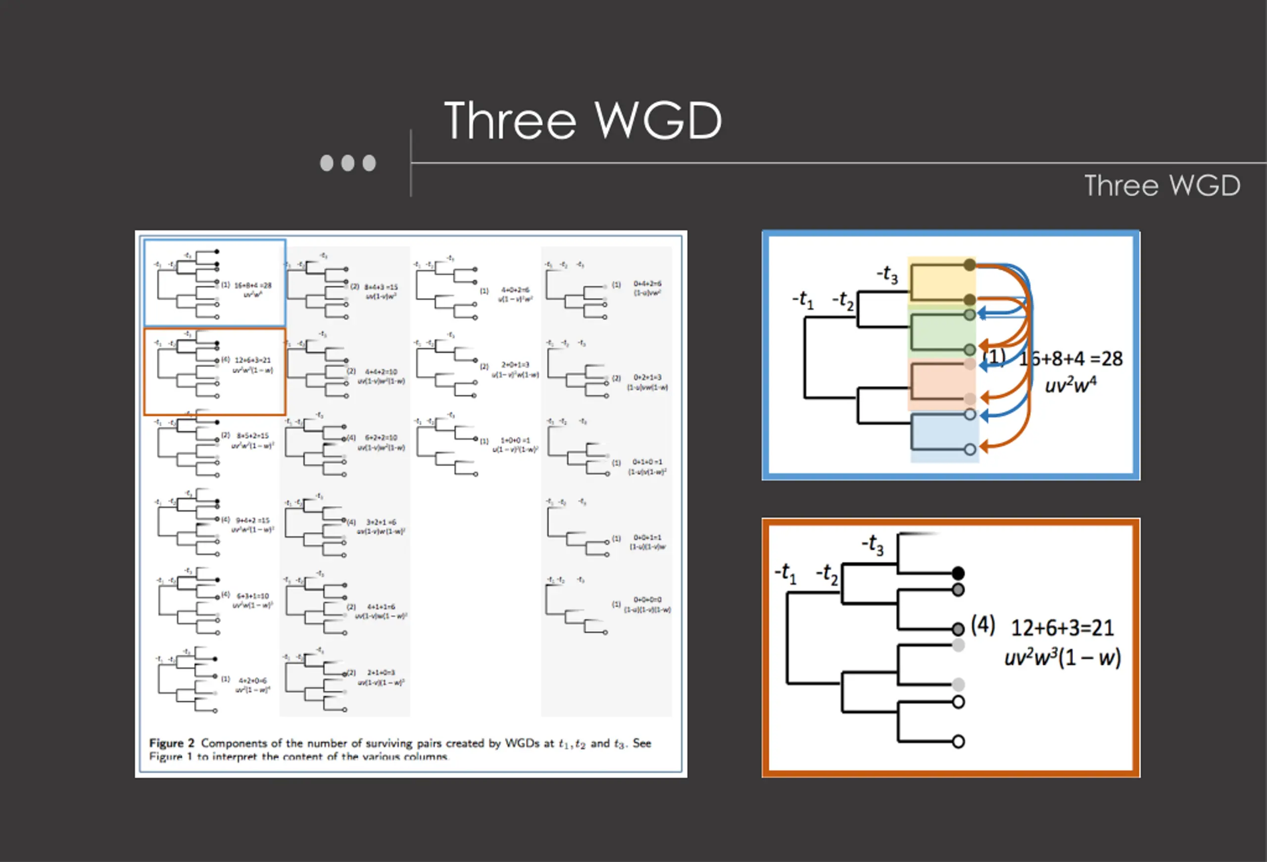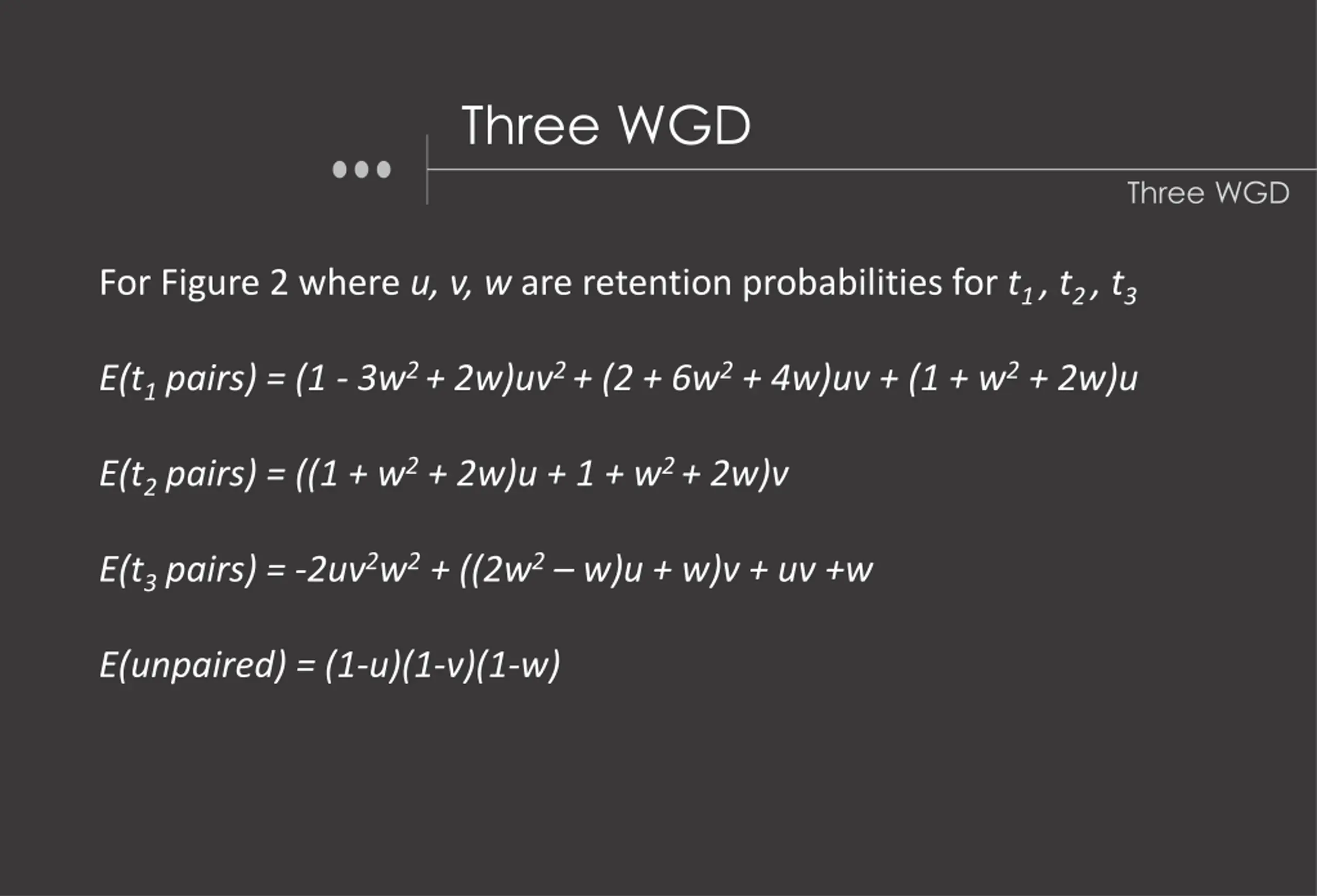 Three WGD Three WGD For Figure 2 where u, v, w are retention probabilities for t1 , t2 , t3 E(t1 pairs) = (1 - 3w2 + 2w)uv2 + (2 + 6w2 + 4w)uv + (1 + w2 + 2w)u E(t2 pairs) = ((1 + w2 + 2w)u + 1 + w2 + 2w)v E(t3 pairs) = -2uv2w2 + ((2w2 w)u + w)v + uv +w E(unpaired) = (1-u)(1-v)(1-w)