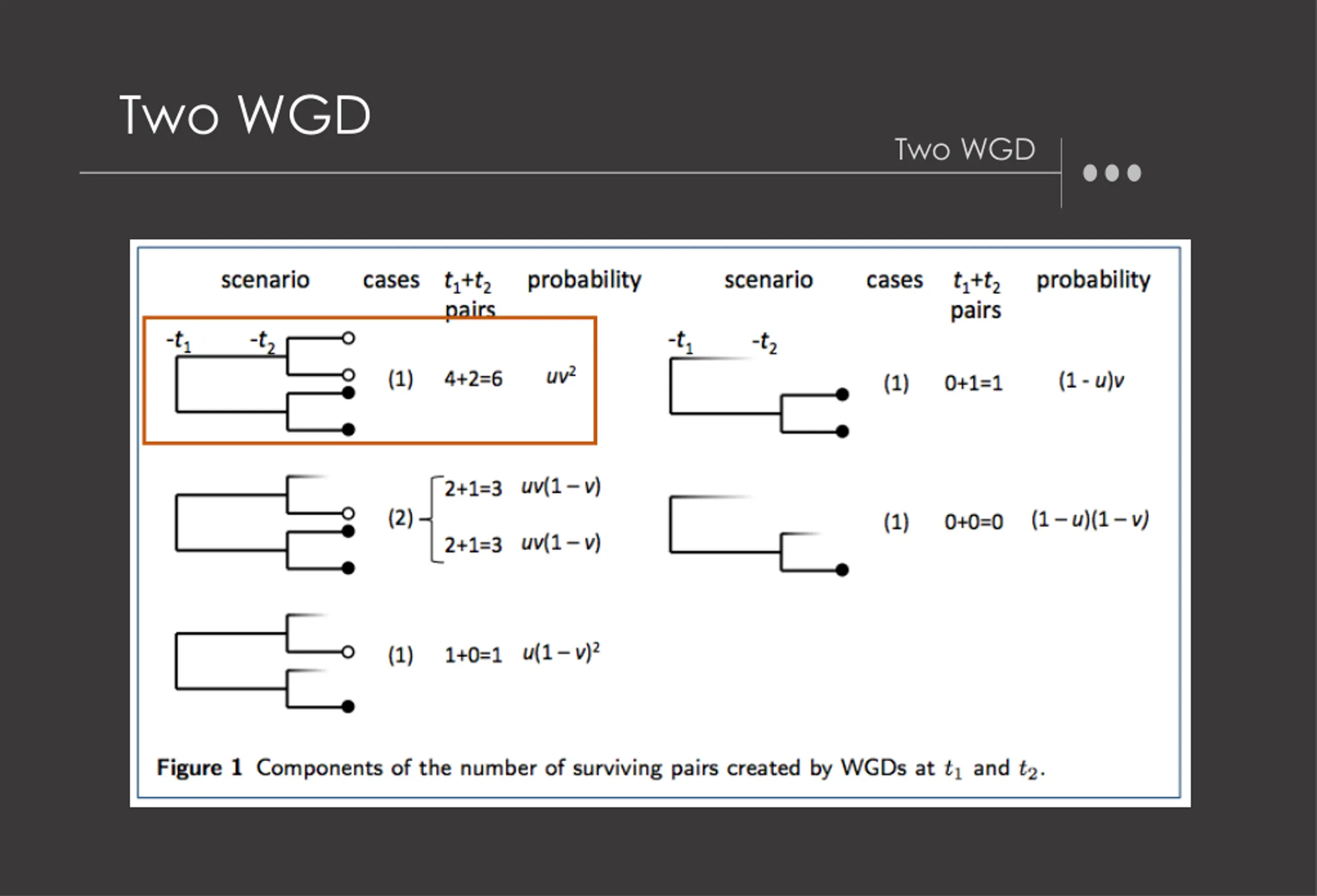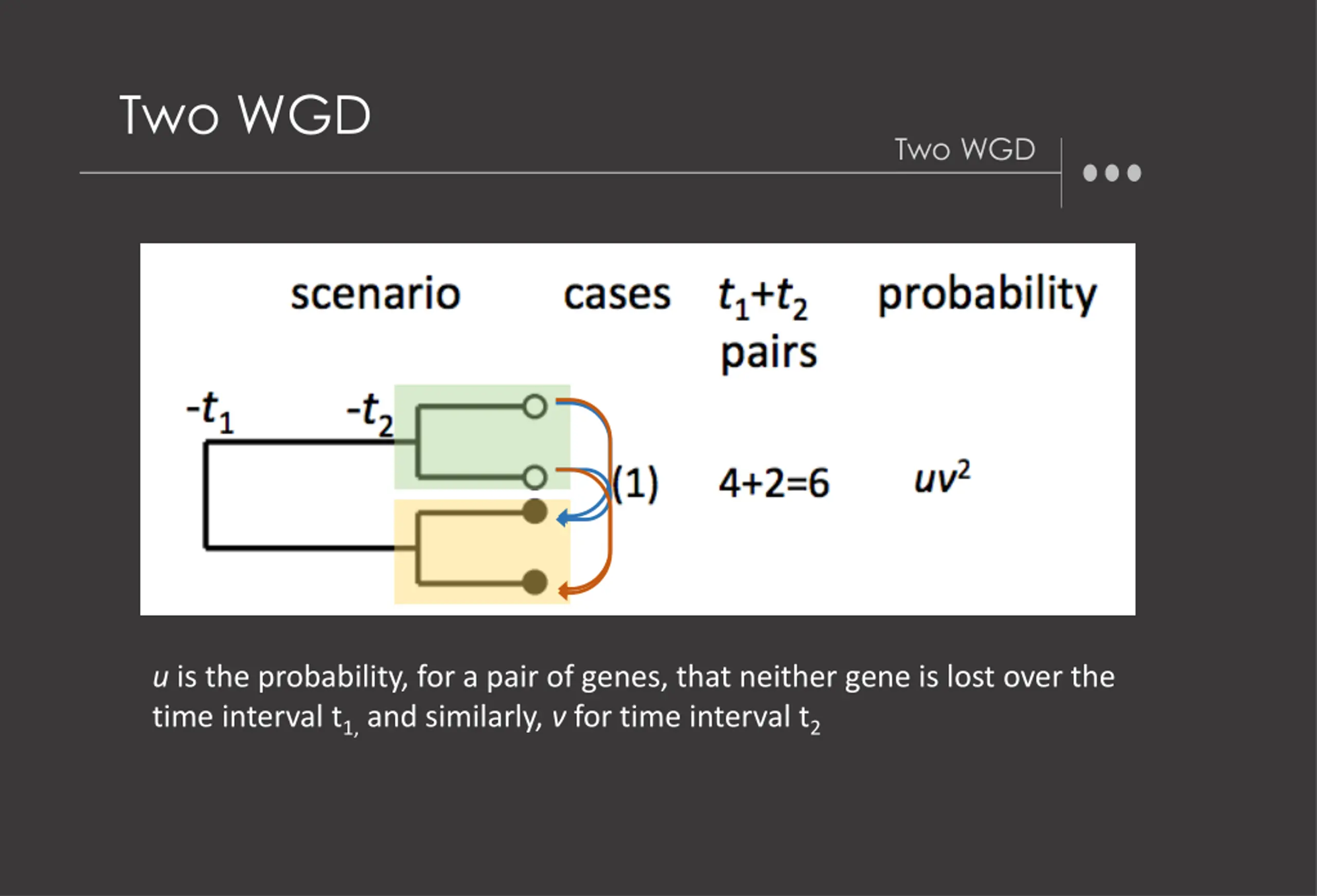 Two WGD Two WGD u is the probability, for a pair of genes, that neither gene is lost over the time interval t1, and similarly, v for time interval t2