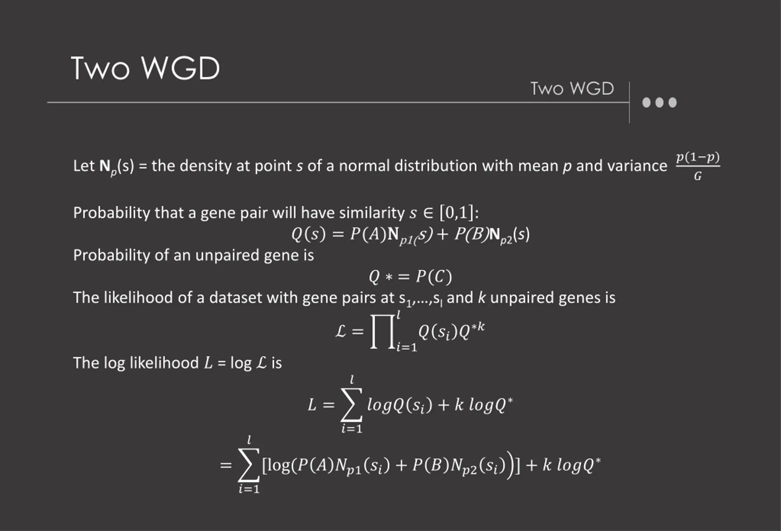Two WGD Two WGD Let Np(s) = the density at point s of a normal distribution with mean p and variance ?(1 ?) ? Probability that a gene pair will have similarity ? 0,1 : ? ? = ?(?)N Np1(s) + P(B)Np2(s) Probability of an unpaired gene is ? = ?(?) The likelihood of a dataset with gene pairs at s1, ,sland k unpaired genes is ? ? ??? ? = ?=1 The log likelihood ? = log is ? ???? ?? + ? ???? ? = ?=1 ? ] + ? ???? = [log( ? ? ??1?? + ? ? ??2?? ?=1