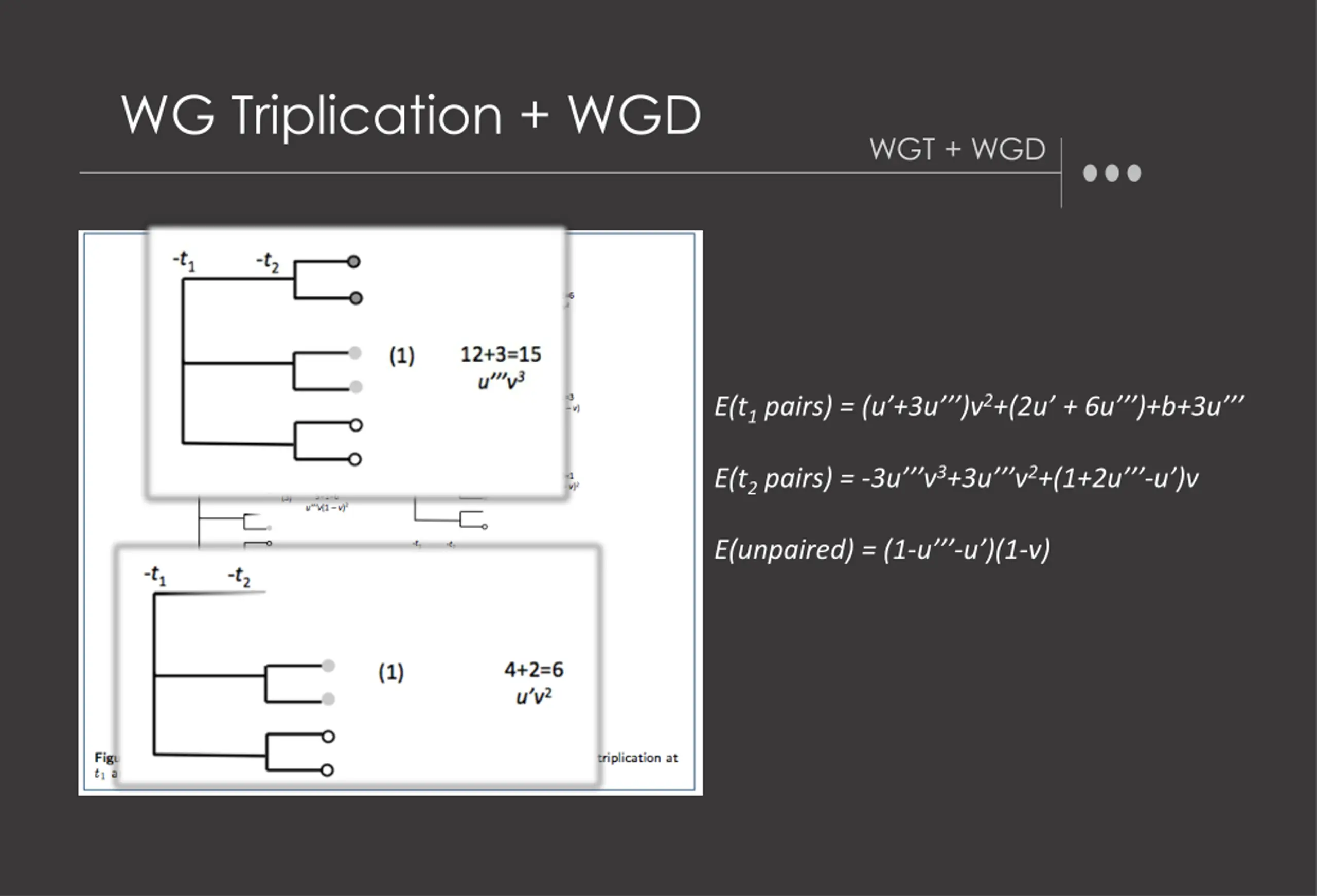 WG Triplication + WGD WGT + WGD E(t1 pairs) = (u +3u )v2+(2u + 6u )+b+3u E(t2 pairs) = -3u v3+3u v2+(1+2u -u )v E(unpaired) = (1-u -u )(1-v)