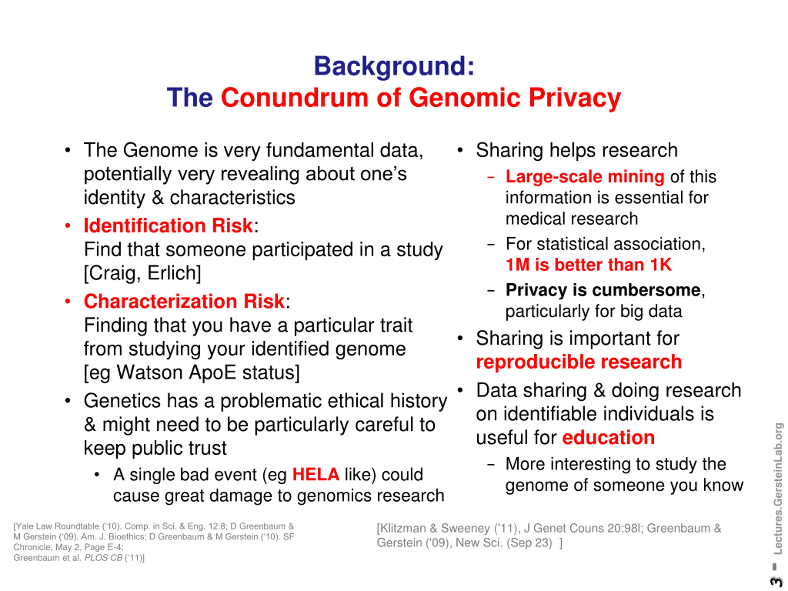 Background: The Conundrum of Genomic Privacy The Genome is very fundamental data, potentially very revealing about one s identity & characteristics Identification Risk: Find that someone participated in a study [Craig, Erlich] Characterization Risk: Finding that you have a particular trait from studying your identified genome [eg Watson ApoE status] Genetics has a problematic ethical history & might need to be particularly careful to keep public trust A single bad event (eg HELA like) could cause great damage to genomics research Sharing helps research - Large-scale mining of this information is essential for medical research - For statistical association, 1M is better than 1K - Privacy is cumbersome, particularly for big data Sharing is important for reproducible research Data sharing & doing research on identifiable individuals is useful for education - More interesting to study the genome of someone you know 3 - Lectures.GersteinLab.org [Yale Law Roundtable ( 10). Comp. in Sci. & Eng. 12:8; D Greenbaum & M Gerstein ( 09). Am. J. Bioethics; D Greenbaum & M Gerstein ( 10). SF Chronicle, May 2, Page E-4; Greenbaum et al. PLOS CB ( 11)] [Klitzman & Sweeney ('11), J Genet Couns 20:98l; Greenbaum & Gerstein ('09), New Sci. (Sep 23) ]