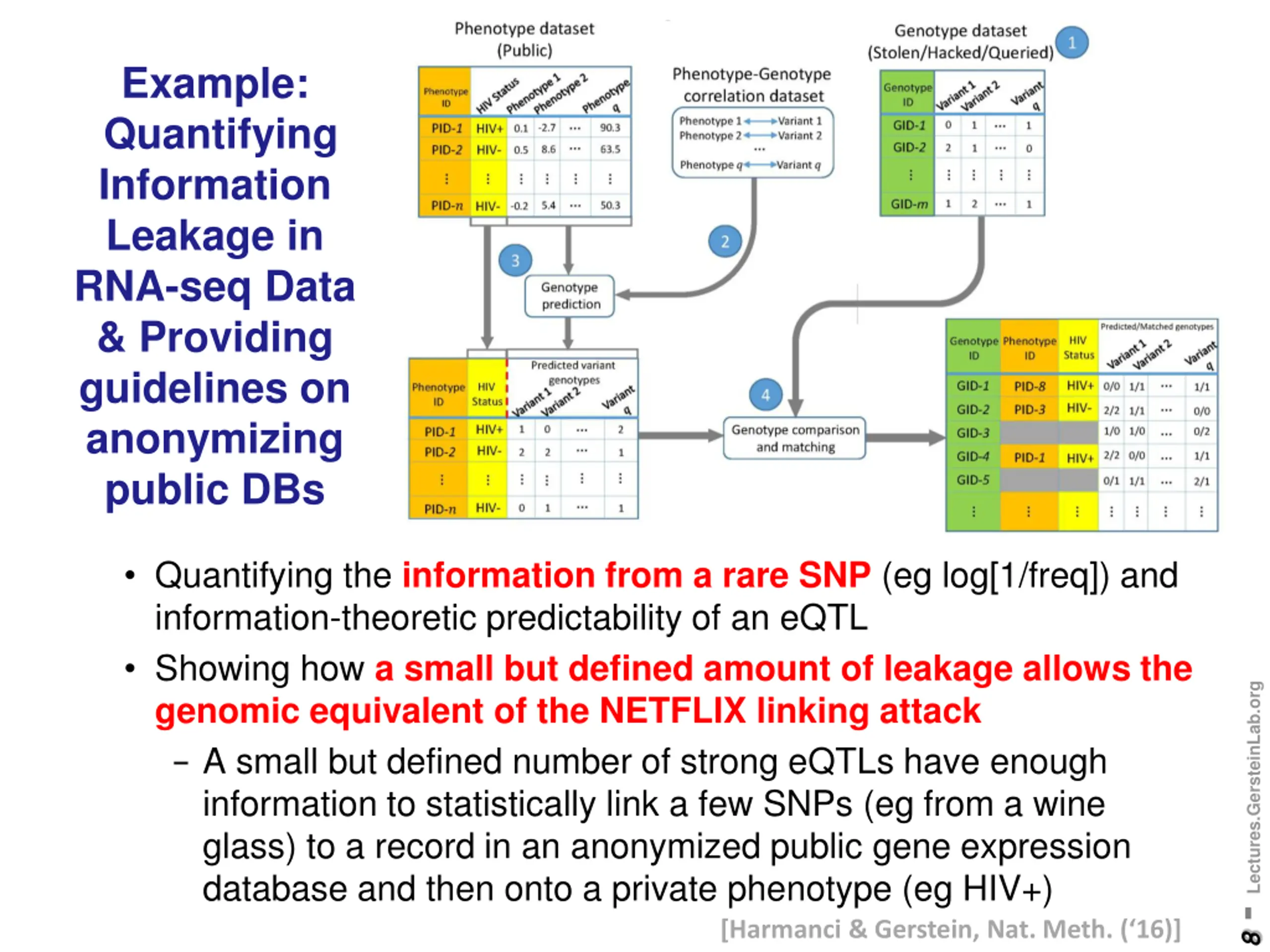 Example: Quantifying Information Leakage in RNA-seq Data & Providing guidelines on anonymizing public DBs Quantifying the information from a rare SNP (eg log[1/freq]) and information-theoretic predictability of an eQTL Showing how a small but defined amount of leakage allows the genomic equivalent of the NETFLIX linking attack - A small but defined number of strong eQTLs have enough information to statistically link a few SNPs (eg from a wine glass) to a record in an anonymized public gene expression database and then onto a private phenotype (eg HIV+) 8 - Lectures.GersteinLab.org [Harmanci & Gerstein, Nat. Meth. ( 16)]