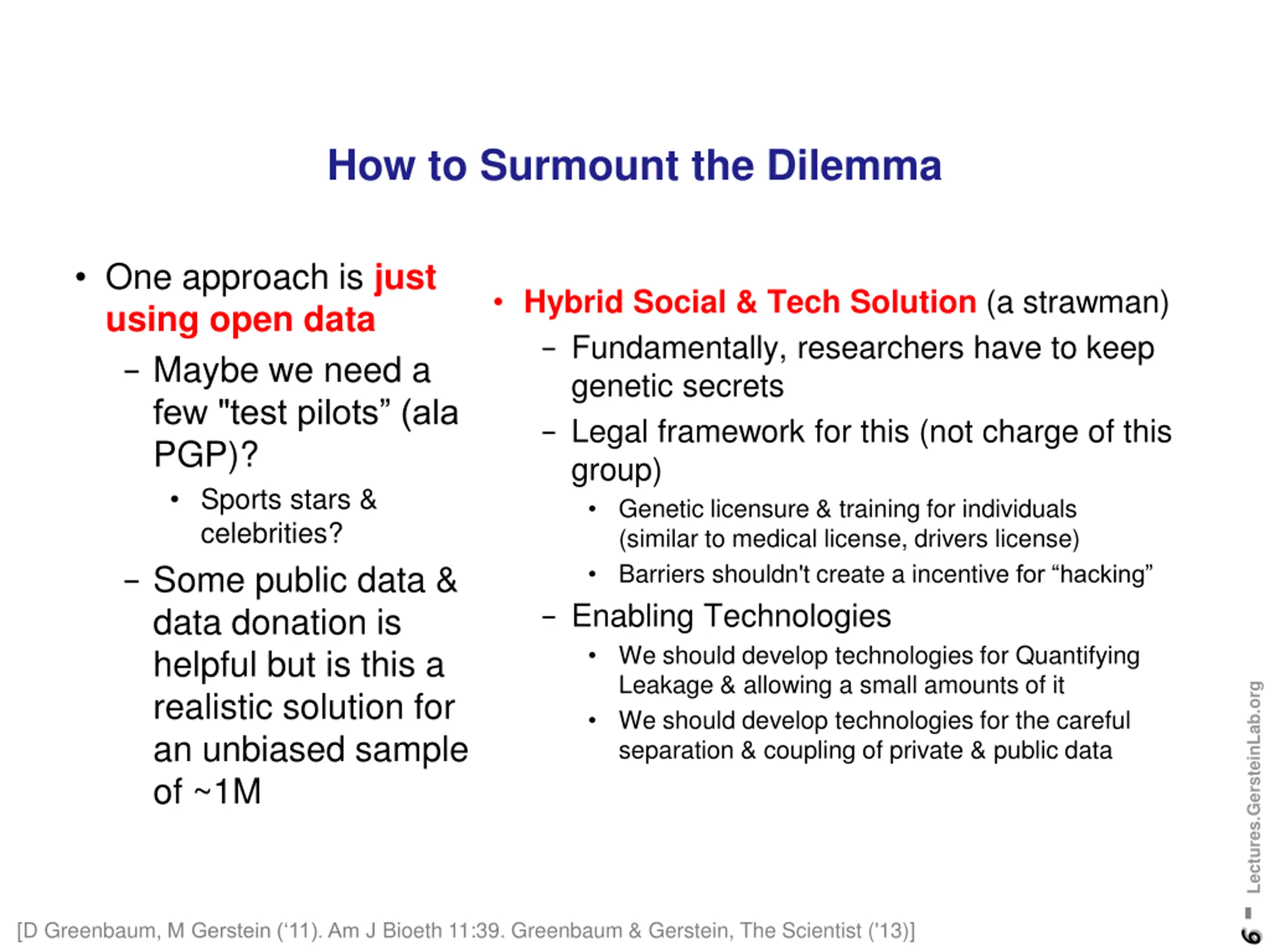 Current Social & Technical Solutions Notion of Consent Protected distribution of data (dbGAP) Local computes on secure computer Practical Issues - Non-uniformity of consents & paperwork Different international norms, leading to confusion - Encryption & computer security creates burdensome requirements on data sharing & large scale analysis - Many schemes get hacked 5 - Lectures.GersteinLab.org [Greenbuam et al ('04), Nat. Biotech; Greenbaum & Gerstein ('13), The Scientist]