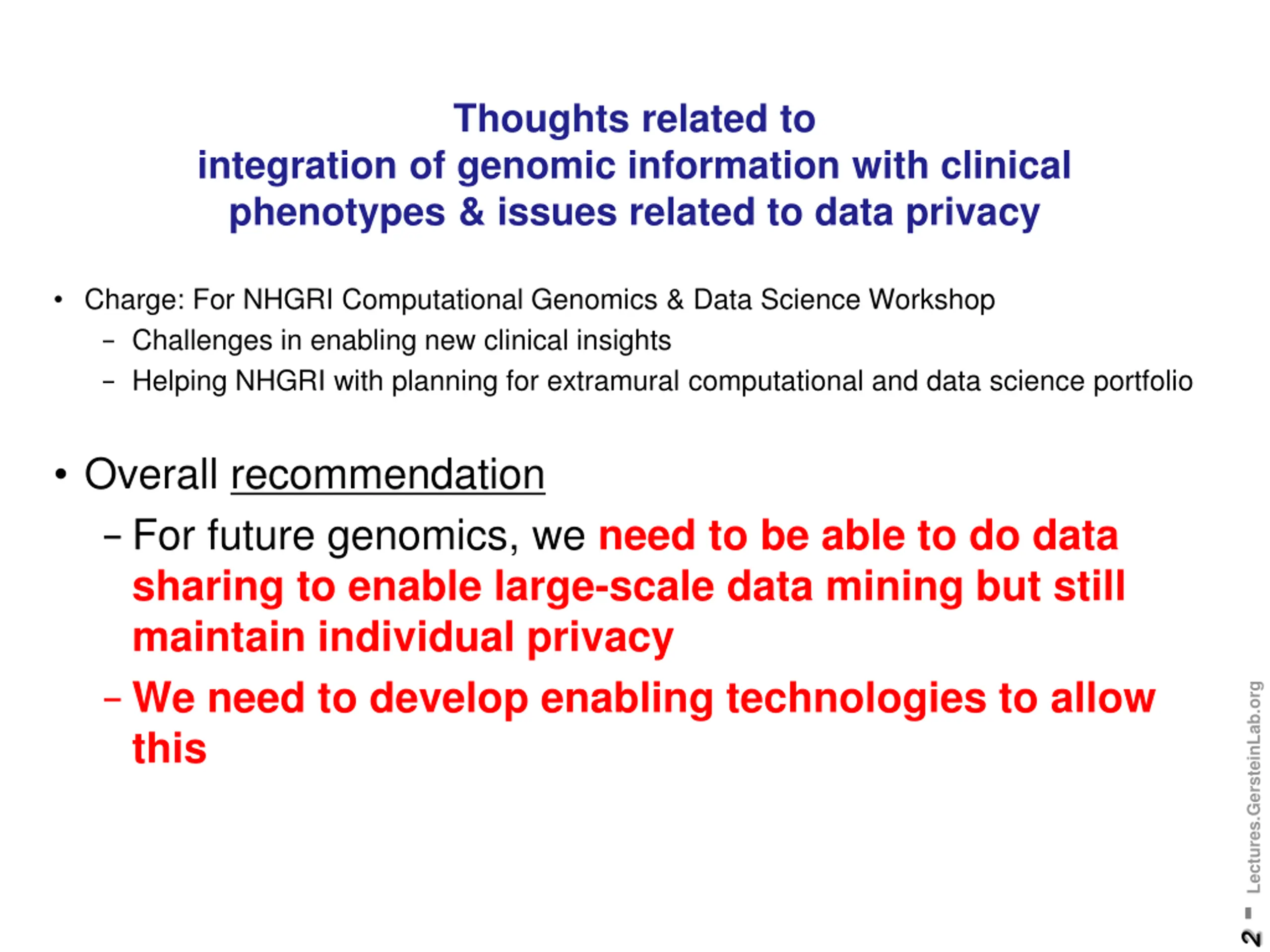 Thoughts related to integration of genomic information with clinical phenotypes & issues related to data privacy Charge: For NHGRI Computational Genomics & Data Science Workshop - Challenges in enabling new clinical insights - Helping NHGRI with planning for extramural computational and data science portfolio Overall recommendation -For future genomics, we need to be able to do data sharing to enable large-scale data mining but still maintain individual privacy -We need to develop enabling technologies to allow this 2 - Lectures.GersteinLab.org