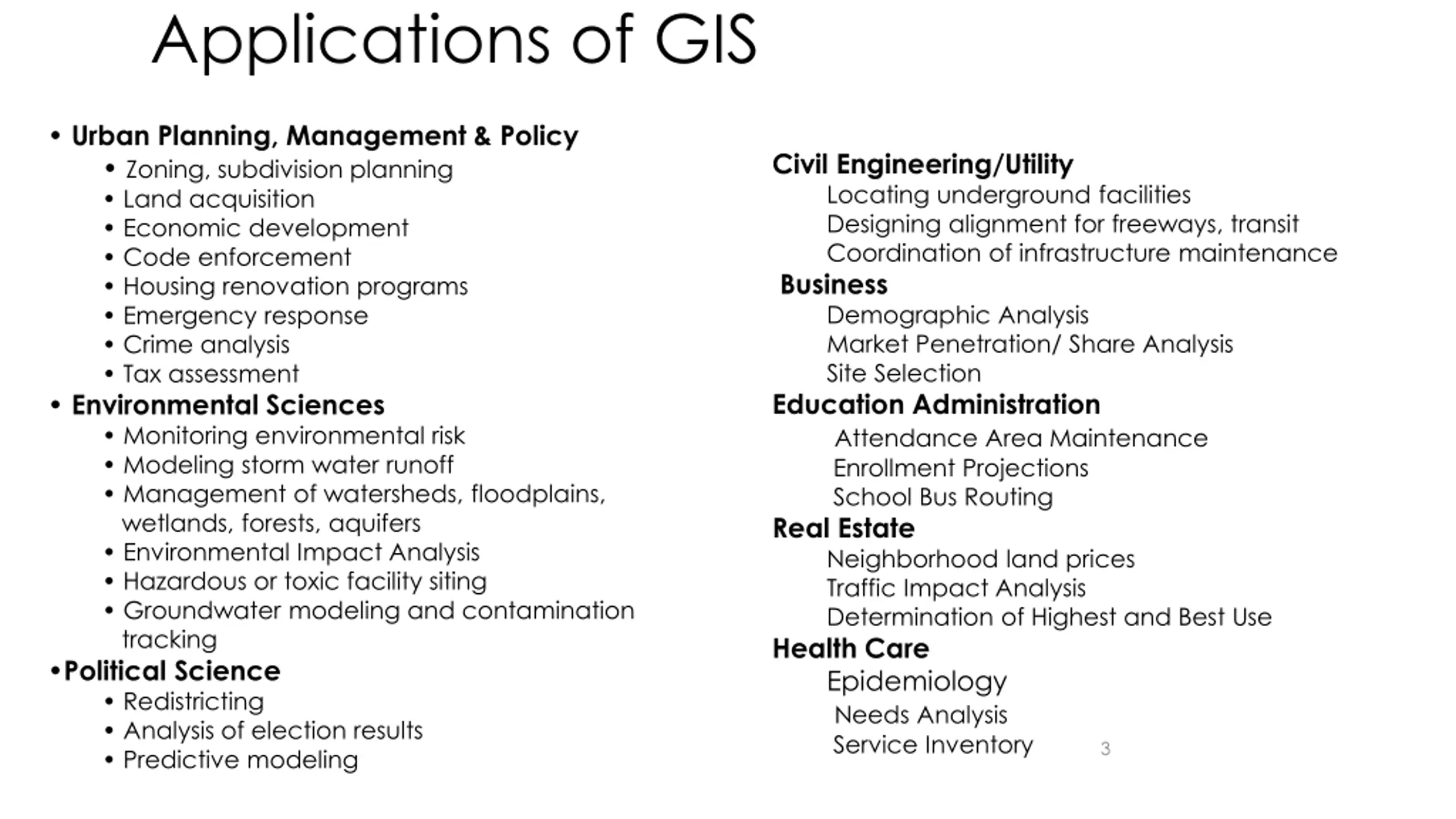 Applications of GIS Urban Planning, Management & Policy Zoning, subdivision planning Land acquisition Economic development Code enforcement Housing renovation programs Emergency response Crime analysis Tax assessment Environmental Sciences Monitoring environmental risk Modeling storm water runoff Management of watersheds, floodplains, wetlands, forests, aquifers Environmental Impact Analysis Hazardous or toxic facility siting Groundwater modeling and contamination tracking Political Science Redistricting Analysis of election results Predictive modeling Civil Engineering/Utility Locating underground facilities Designing alignment for freeways, transit Coordination of infrastructure maintenance Business Demographic Analysis Market Penetration/ Share Analysis Site Selection Education Administration Attendance Area Maintenance Enrollment Projections School Bus Routing Real Estate Neighborhood land prices Traffic Impact Analysis Determination of Highest and Best Use Health Care Epidemiology Needs Analysis Service Inventory 3