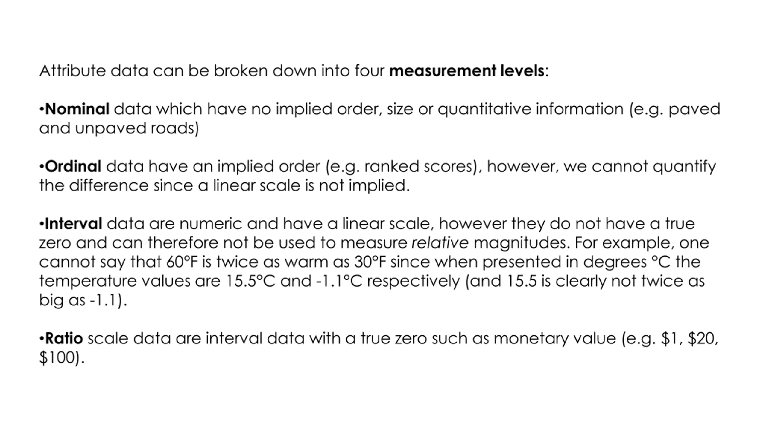 Attribute data can be broken down into four measurement levels: Nominal data which have no implied order, size or quantitative information (e.g. paved and unpaved roads) Ordinal data have an implied order (e.g. ranked scores), however, we cannot quantify the difference since a linear scale is not implied. Interval data are numeric and have a linear scale, however they do not have a true zero and can therefore not be used to measure relative magnitudes. For example, one cannot say that 60 F is twice as warm as 30 F since when presented in degrees C the temperature values are 15.5 C and -1.1 C respectively (and 15.5 is clearly not twice as big as -1.1). Ratio scale data are interval data with a true zero such as monetary value (e.g. $1, $20, $100).