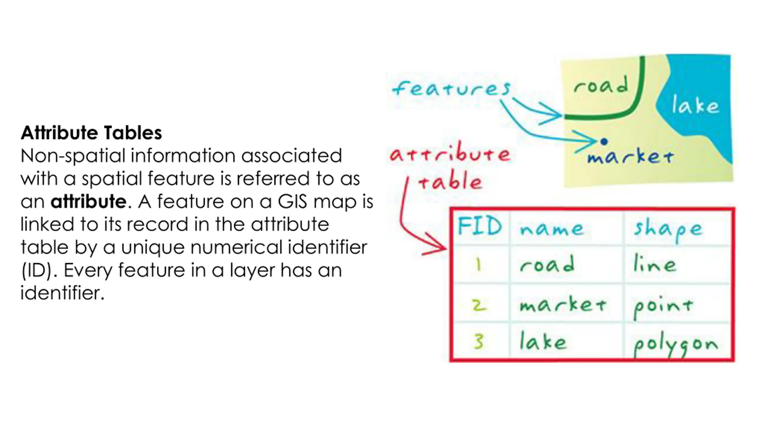 Attribute Tables Non-spatial information associated with a spatial feature is referred to as an attribute. A feature on a GIS map is linked to its record in the attribute table by a unique numerical identifier (ID). Every feature in a layer has an identifier.