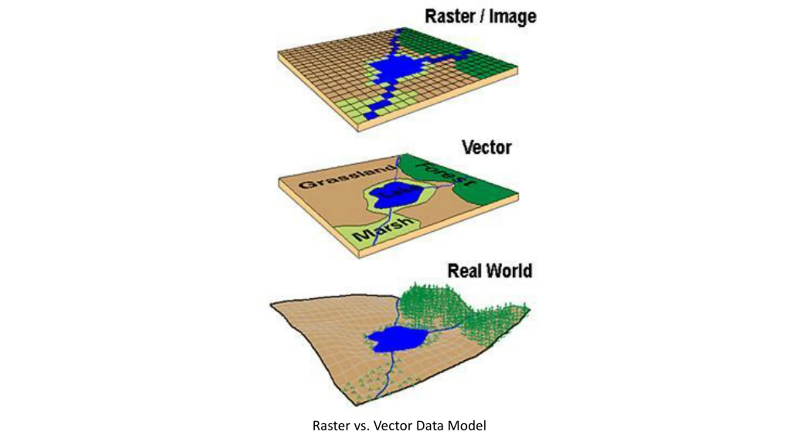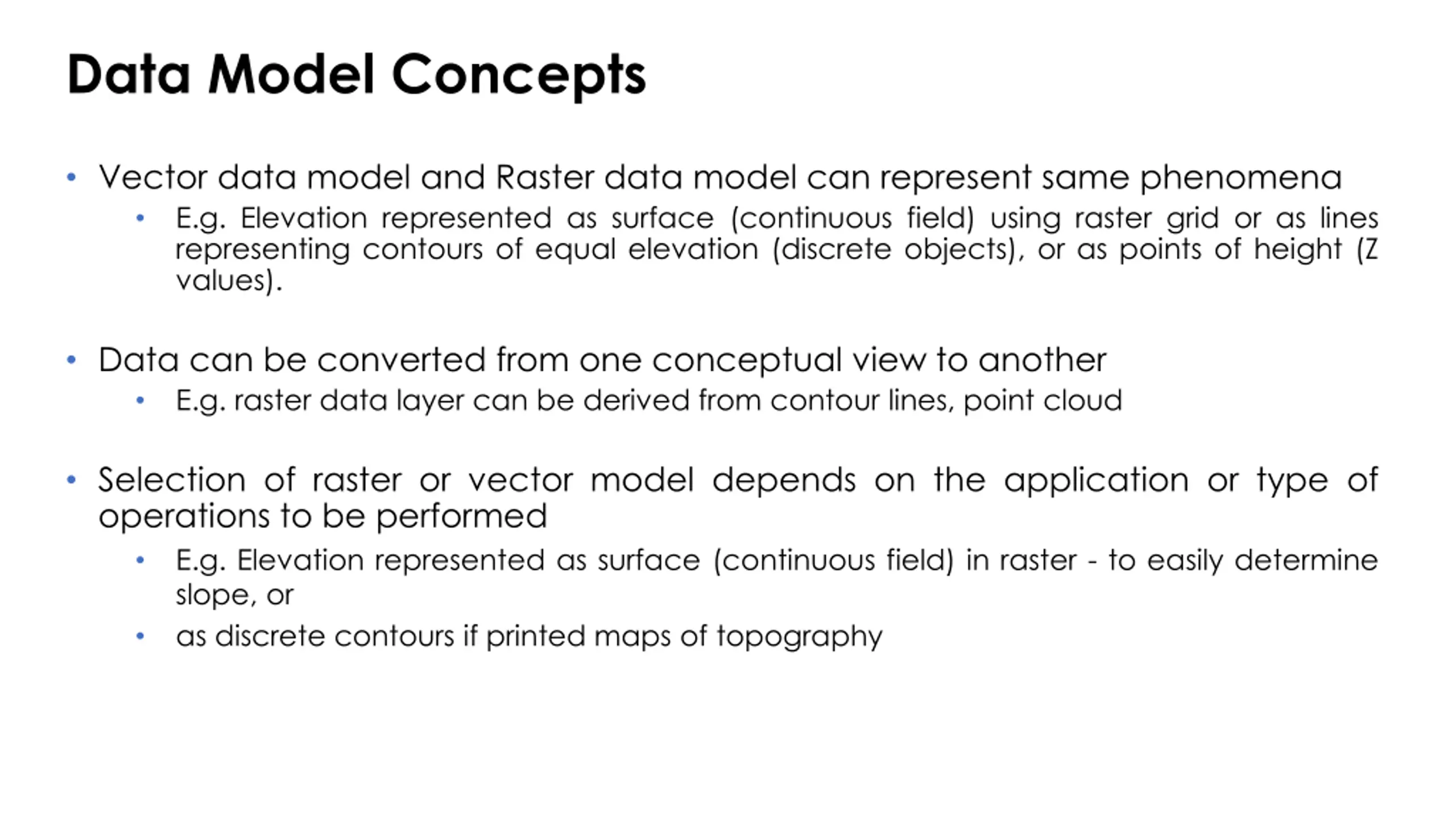 Data Model Concepts Vector data model and Raster data model can represent same phenomena E.g. Elevation represented as surface (continuous field) using raster grid or as lines representing contours of equal elevation (discrete objects), or as points of height (Z values). Data can be converted from one conceptual view to another E.g. raster data layer can be derived from contour lines, point cloud Selection of raster or vector model depends on the application or type of operations to be performed E.g. Elevation represented as surface (continuous field) in raster - to easily determine slope, or as discrete contours if printed maps of topography