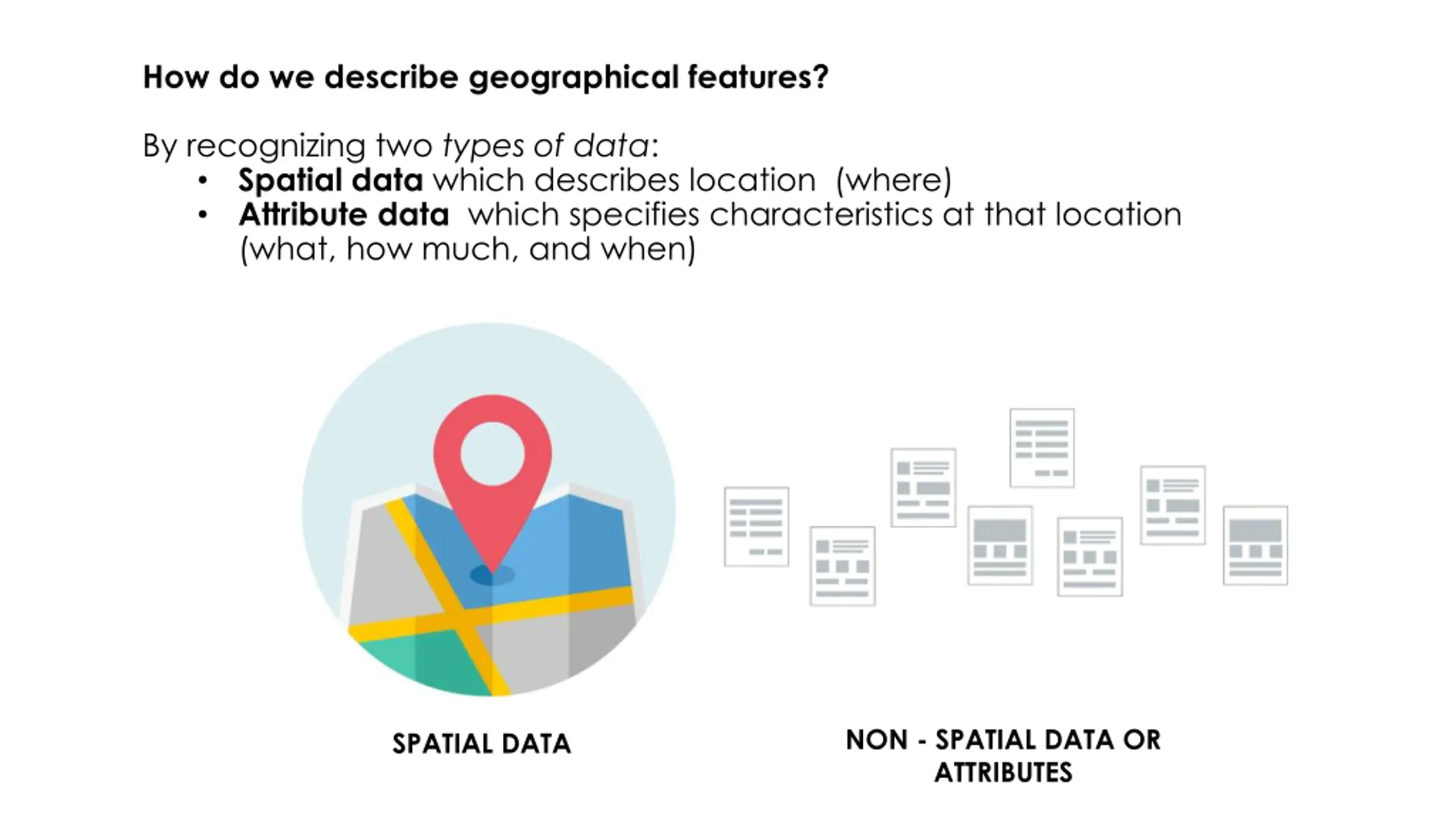 How do we describe geographical features? By recognizing two types of data: Spatial data which describes location (where) Attribute data which specifies characteristics at that location (what, how much, and when) NON - SPATIAL DATA OR ATTRIBUTES SPATIAL DATA