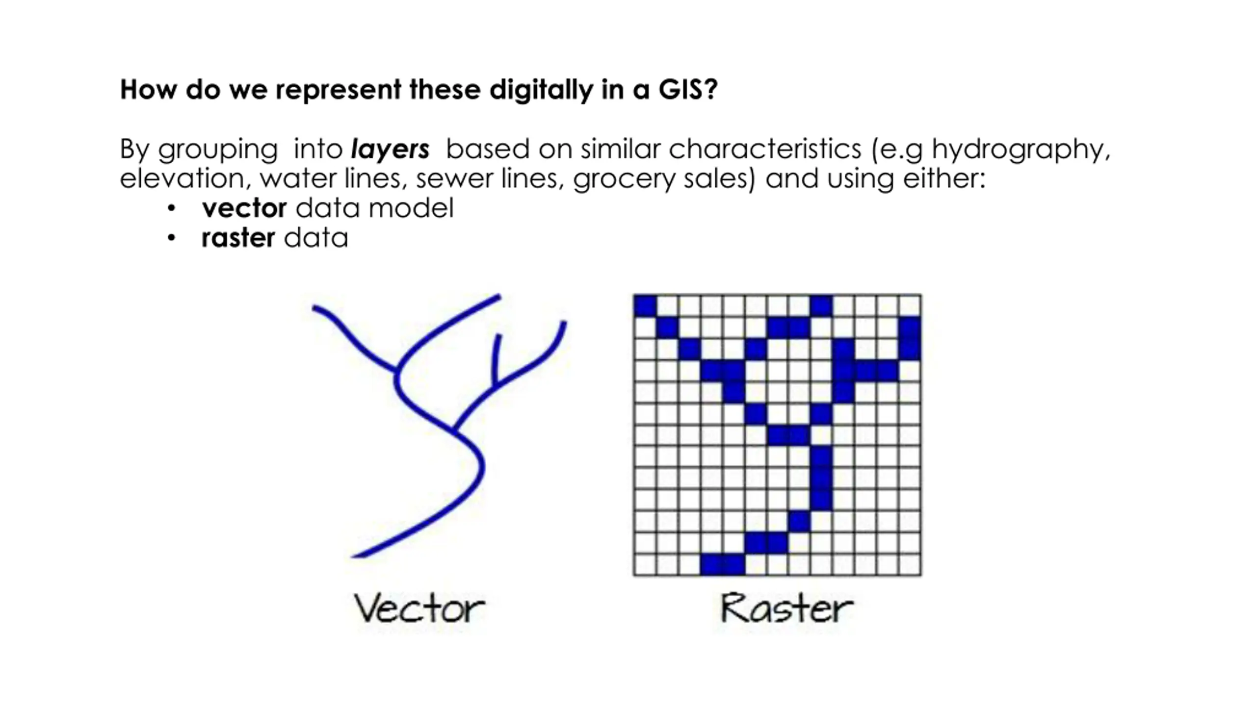 How do we represent these digitally in a GIS? By grouping into layers based on similar characteristics (e.g hydrography, elevation, water lines, sewer lines, grocery sales) and using either: vector data model raster data