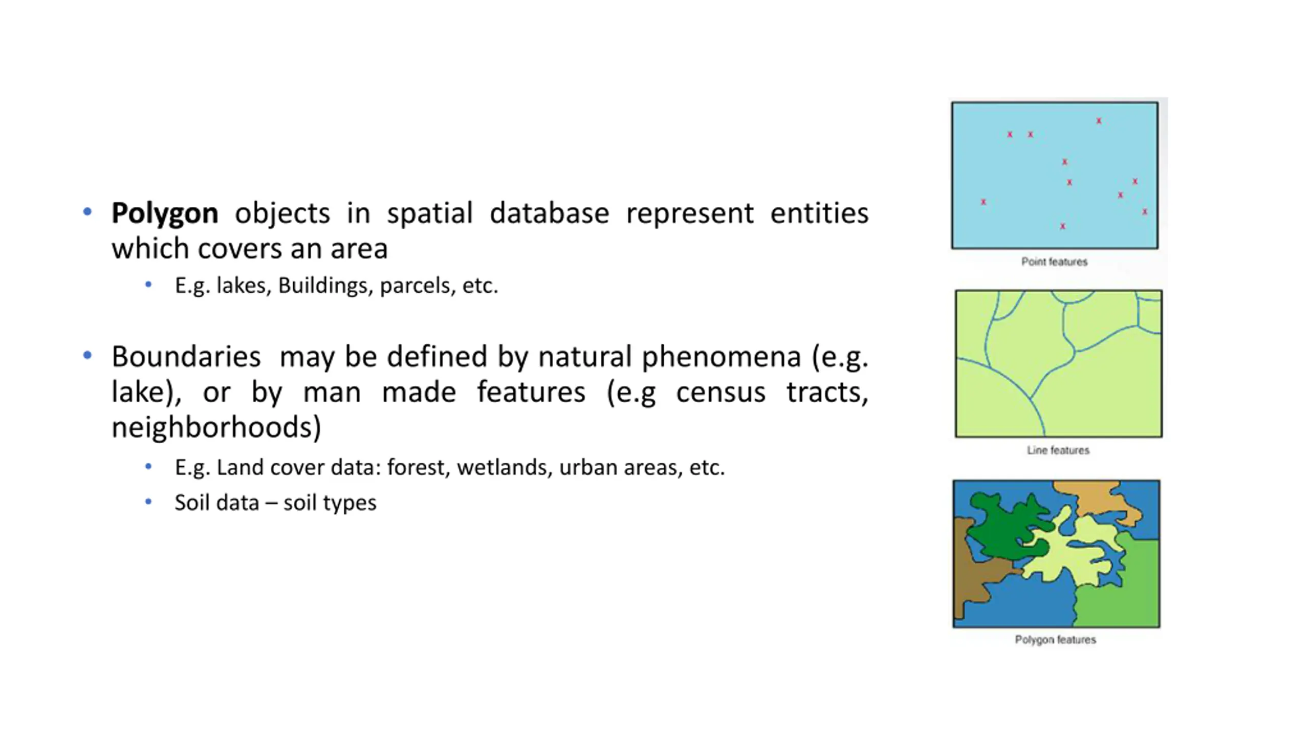 Polygon objects in spatial database represent entities which covers an area E.g. lakes, Buildings, parcels, etc. Boundaries may be defined by natural phenomena (e.g. lake), or by man made features (e.g census tracts, neighborhoods) E.g. Land cover data: forest, wetlands, urban areas, etc. Soil data soil types