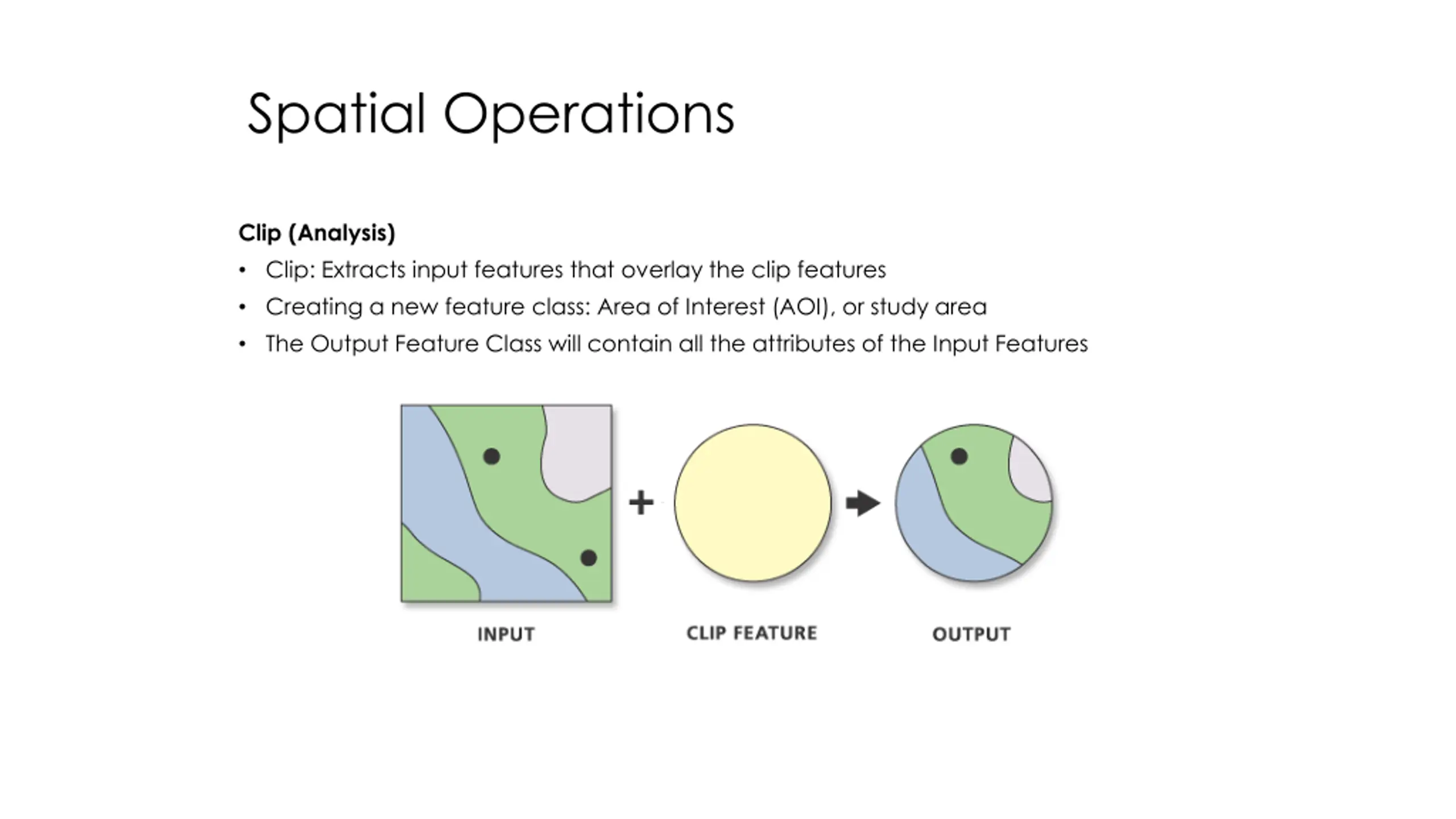 Spatial Operations Clip (Analysis) Clip: Extracts input features that overlay the clip features Creating a new feature class: Area of Interest (AOI), or study area The Output Feature Class will contain all the attributes of the Input Features