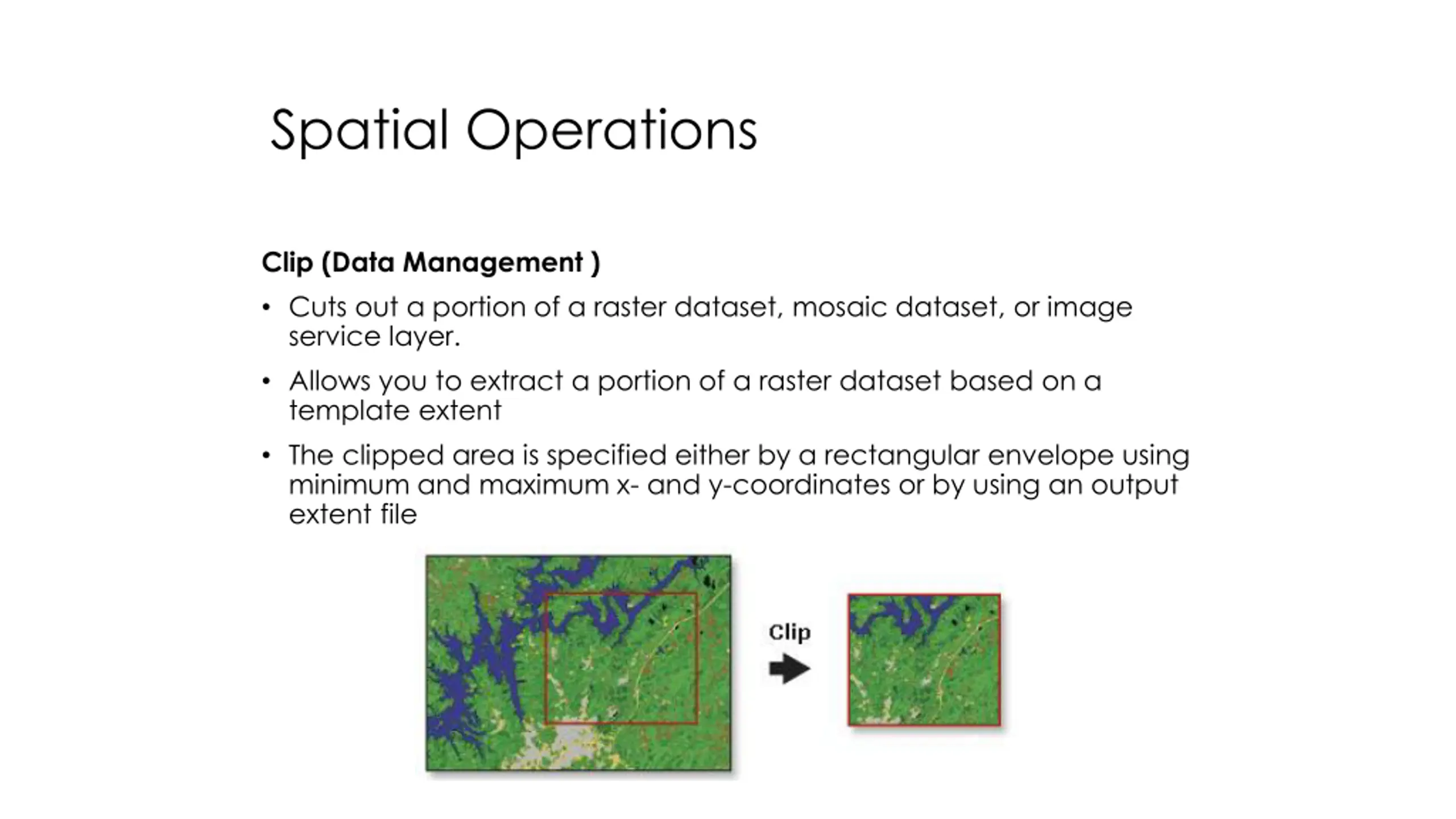 Spatial Operations Clip (Data Management ) Cuts out a portion of a raster dataset, mosaic dataset, or image service layer. Allows you to extract a portion of a raster dataset based on a template extent The clipped area is specified either by a rectangular envelope using minimum and maximum x- and y-coordinates or by using an output extent file