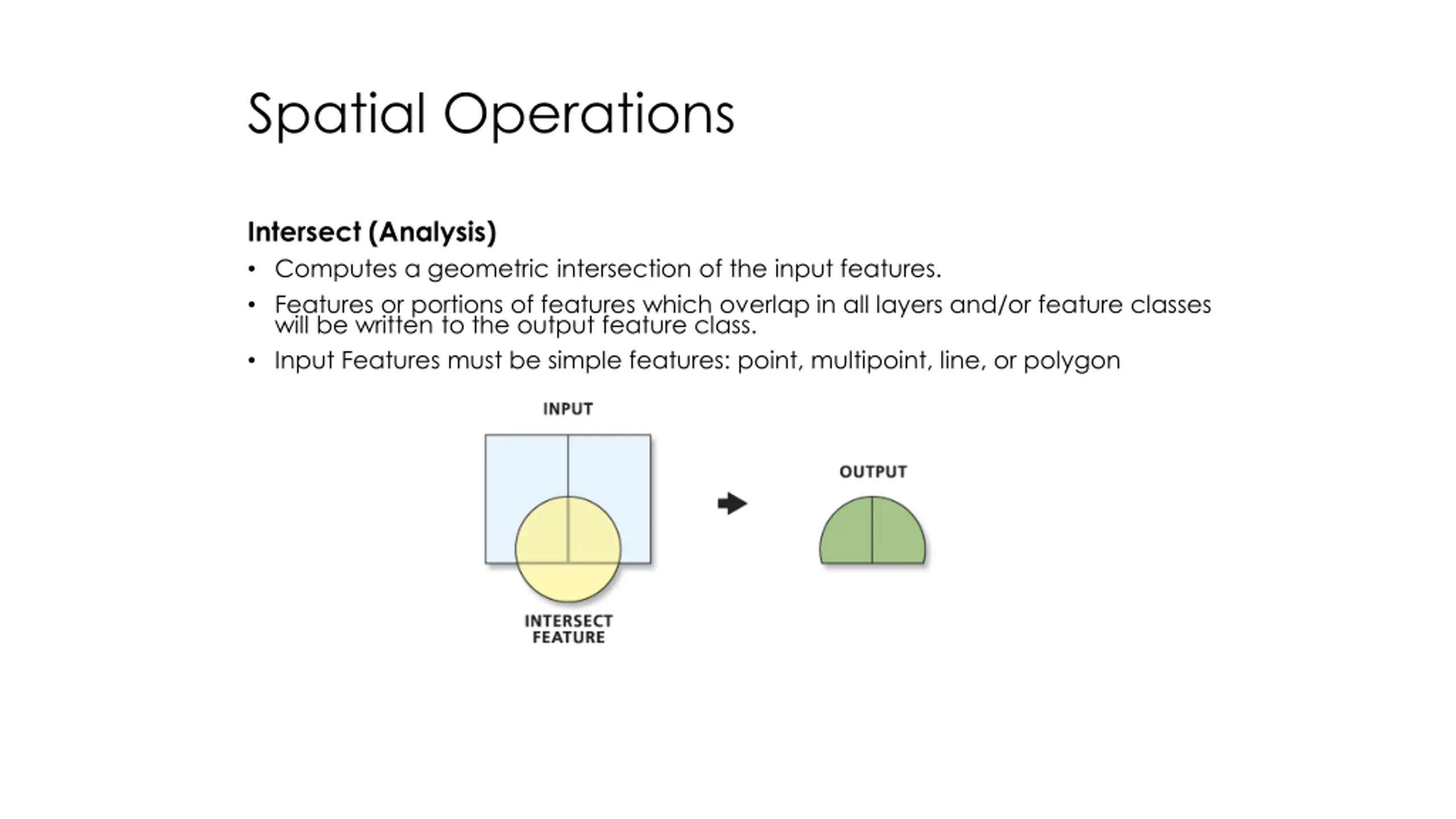 Spatial Operations Intersect (Analysis) Computes a geometric intersection of the input features. Features or portions of features which overlap in all layers and/or feature classes will be written to the output feature class. Input Features must be simple features: point, multipoint, line, or polygon