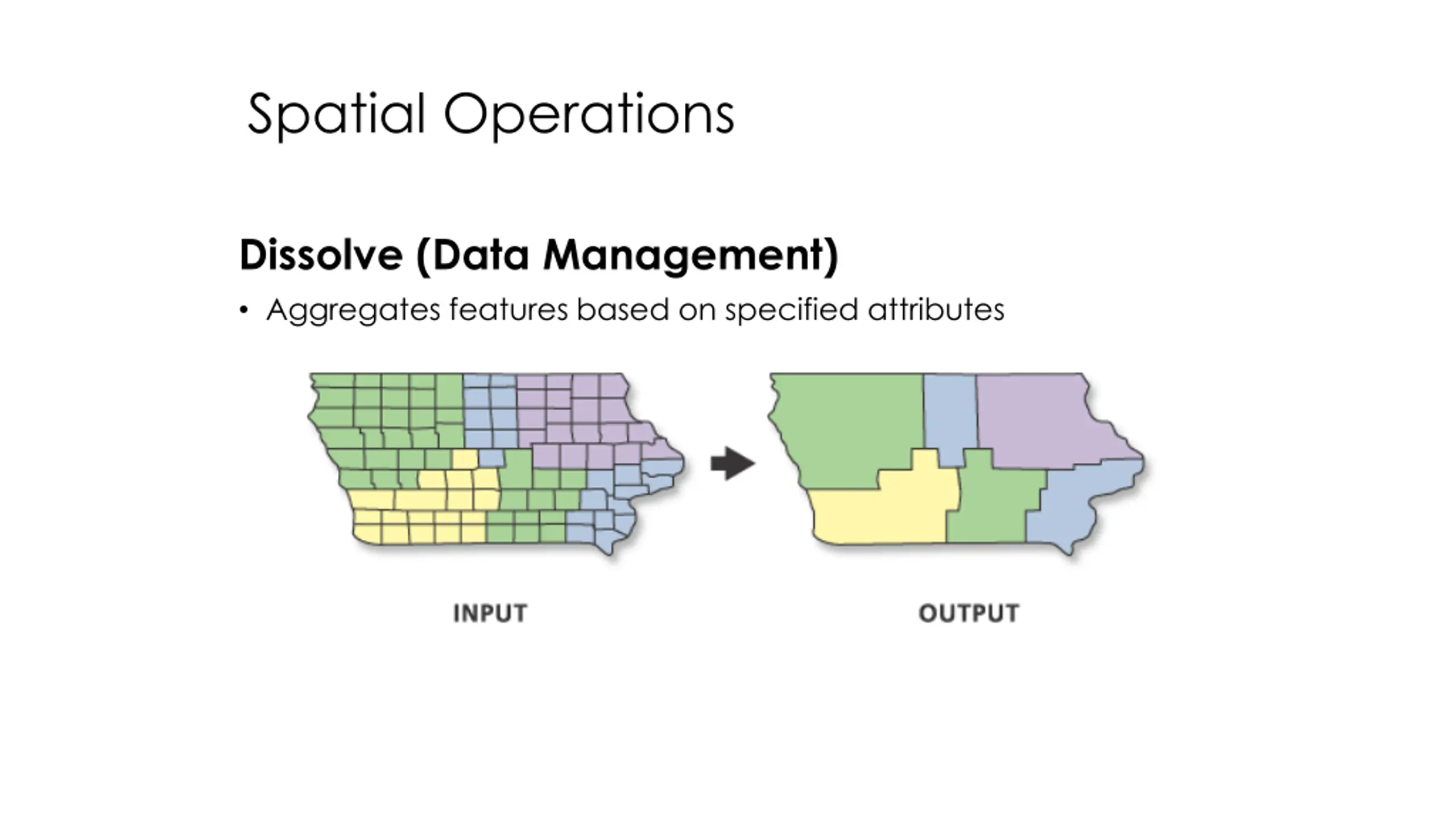 Spatial Operations Dissolve (Data Management) Aggregates features based on specified attributes