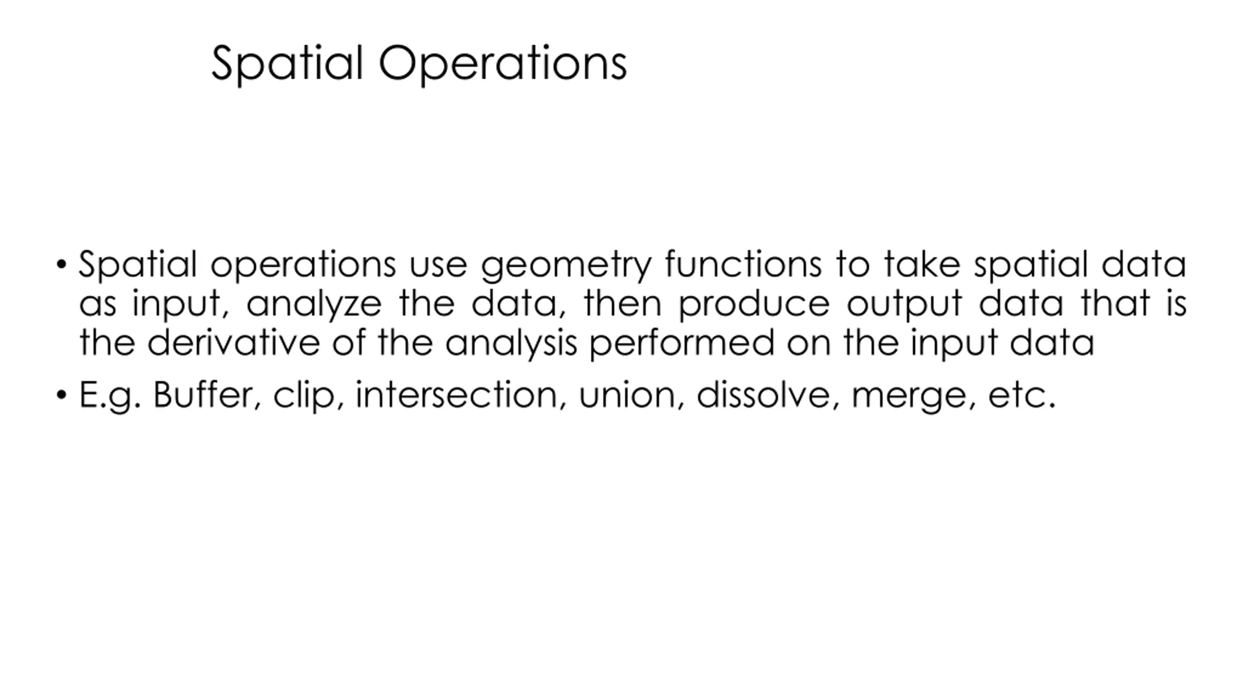 Spatial Operations Spatial operations use geometry functions to take spatial data as input, analyze the data, then produce output data that is the derivative of the analysis performed on the input data E.g. Buffer, clip, intersection, union, dissolve, merge, etc.