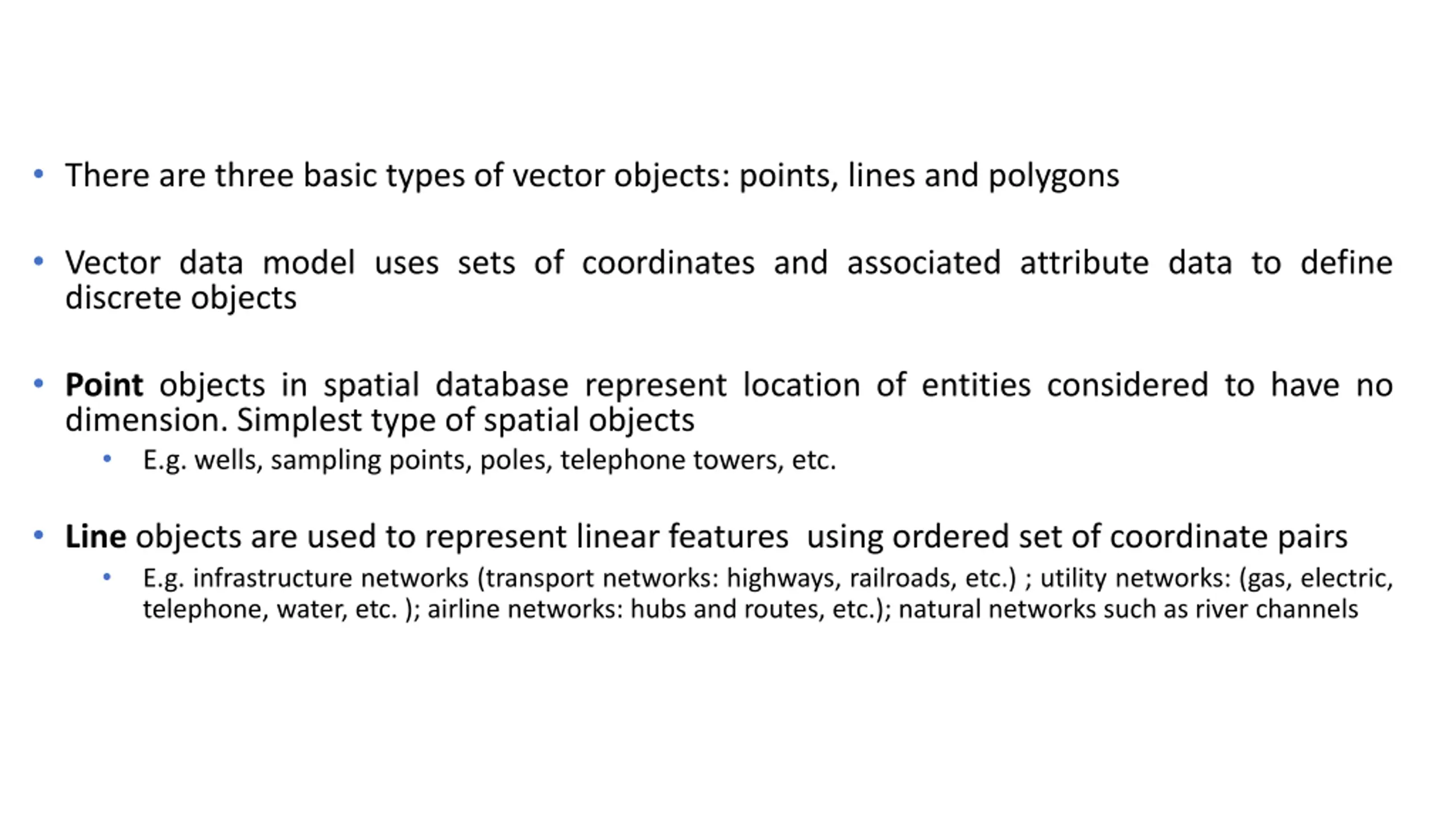 There are three basic types of vector objects: points, lines and polygons Vector data model uses sets of coordinates and associated attribute data to define discrete objects Point objects in spatial database represent location of entities considered to have no dimension. Simplest type of spatial objects E.g. wells, sampling points, poles, telephone towers, etc. Line objects are used to represent linear features using ordered set of coordinate pairs E.g. infrastructure networks (transport networks: highways, railroads, etc.) ; utility networks: (gas, electric, telephone, water, etc. ); airline networks: hubs and routes, etc.); natural networks such as river channels