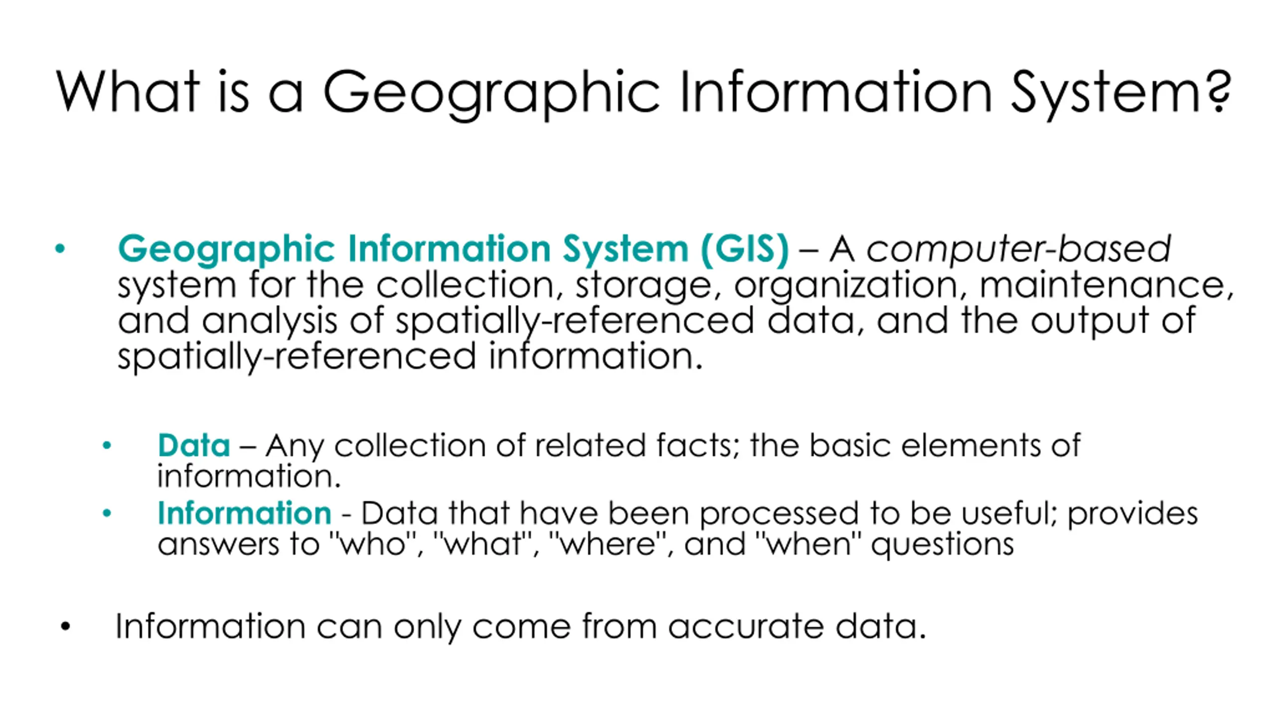 What is a Geographic Information System? Geographic Information System (GIS) A computer-based system for the collection, storage, organization, maintenance, and analysis of spatially-referenced data, and the output of spatially-referenced information. Data Any collection of related facts; the basic elements of information. Information - Data that have been processed to be useful; provides answers to "who", "what", "where", and "when" questions Information can only come from accurate data.