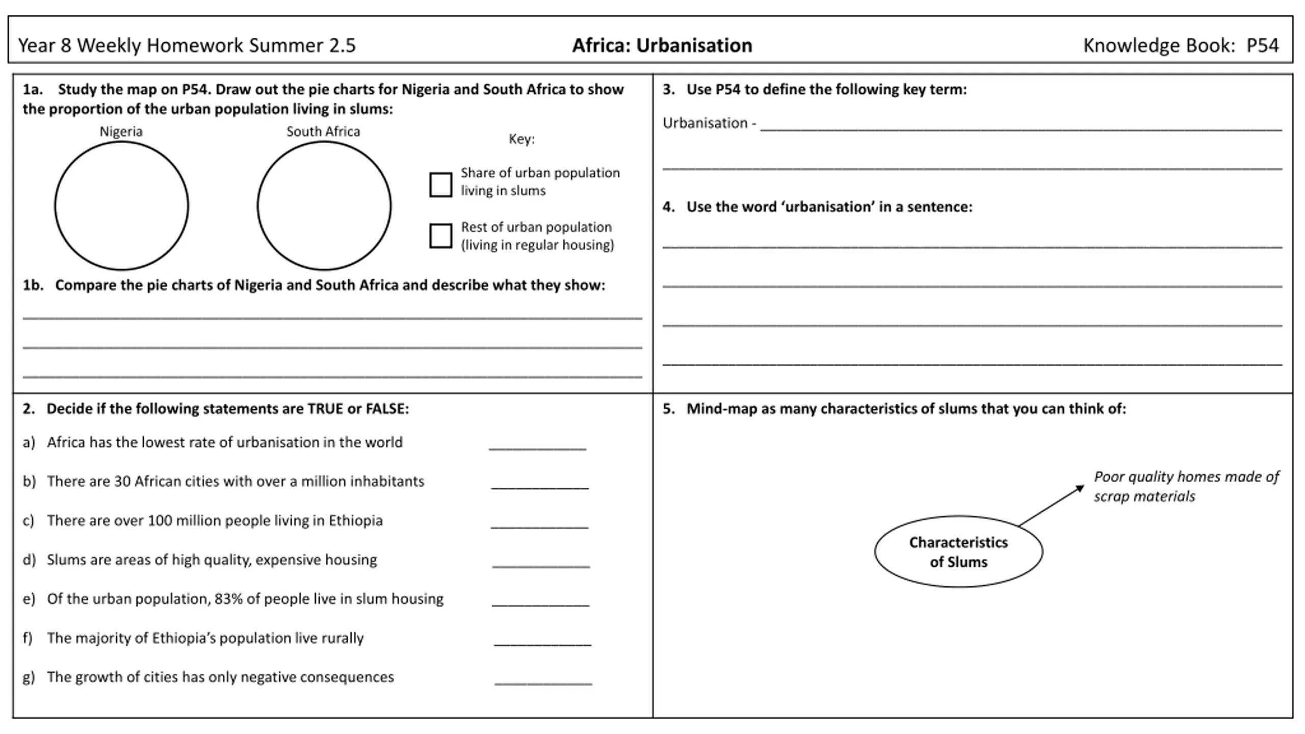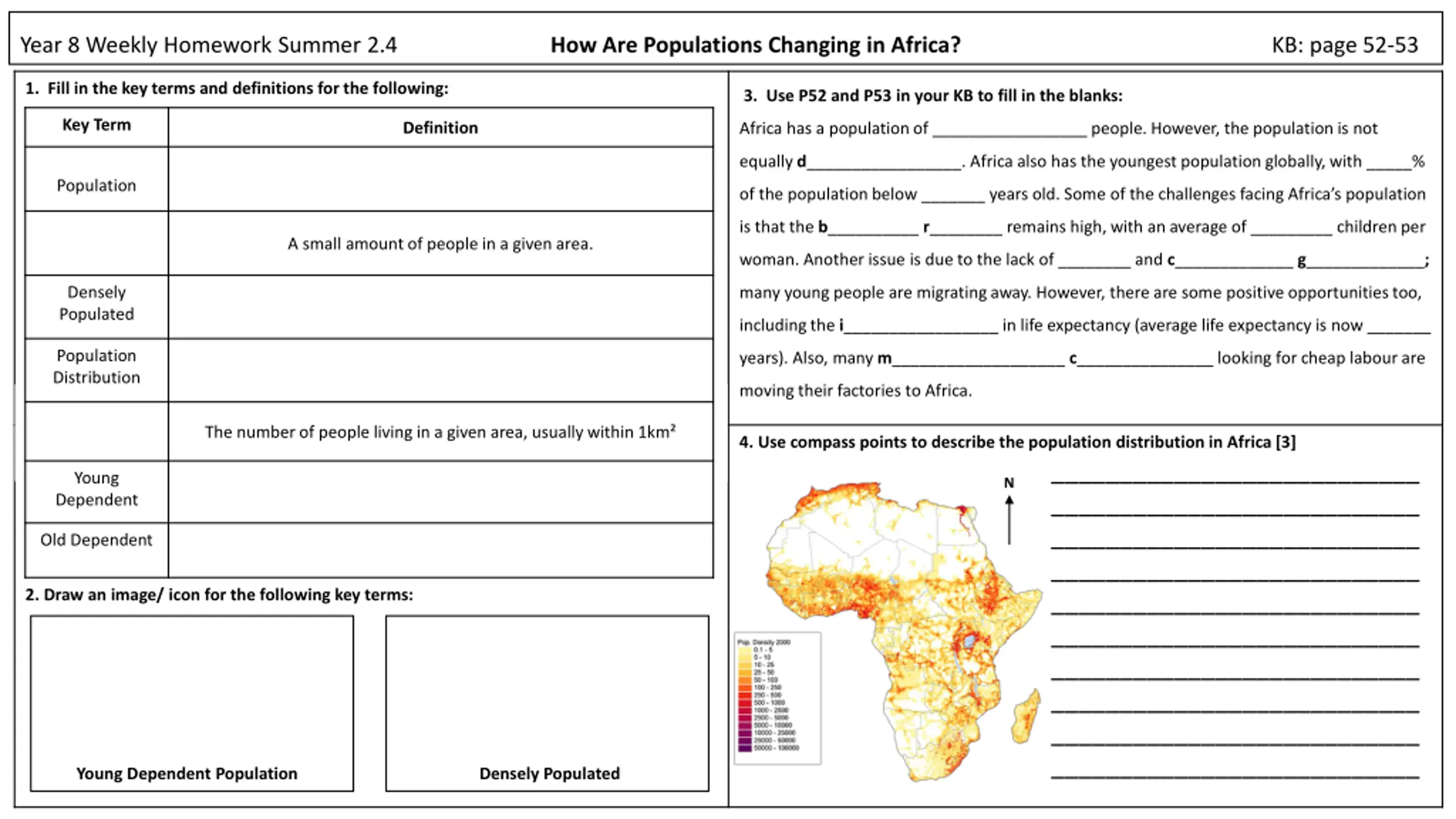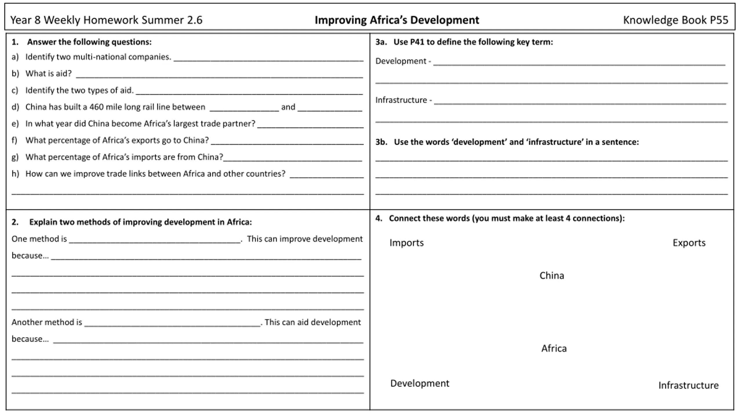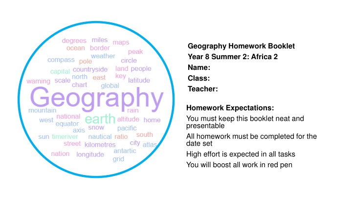 Geography Homework Booklet Year 8 Summer 2: Africa 2 Name: Class: Teacher: Homework Expectations: You must keep this booklet neat and presentable All homework must be completed for the date set High effort is expected in all tasks You will boost all work in red pen