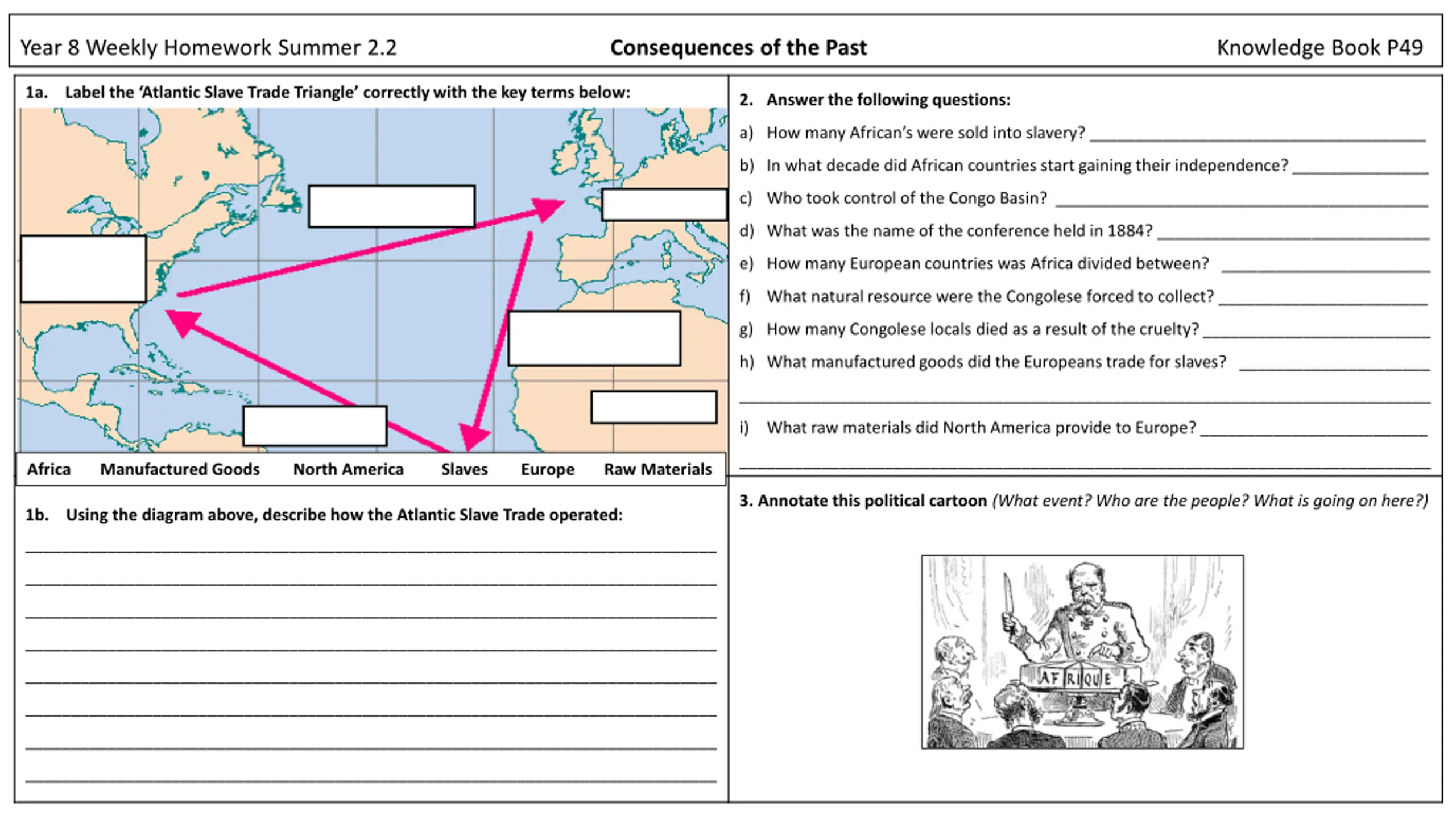 Year 8 Weekly Homework Summer 2.2 Consequences of the Past Knowledge Book P49 1a. Label the Atlantic Slave Trade Triangle correctly with the key terms below: 2. Answer the following questions: a) How many African s were sold into slavery? _____________________________________ b) In what decade did African countries start gaining their independence? _______________ c) Who took control of the Congo Basin? _________________________________________ d) What was the name of the conference held in 1884? ______________________________ e) How many European countries was Africa divided between? _______________________ f) What natural resource were the Congolese forced to collect? _______________________ g) How many Congolese locals died as a result of the cruelty? _________________________ h) What manufactured goods did the Europeans trade for slaves? _____________________ ____________________________________________________________________________ i) What raw materials did North America provide to Europe? _________________________ ____________________________________________________________________________ Africa Manufactured Goods North America Slaves Europe Raw Materials 3. Annotate this political cartoon (What event? Who are the people? What is going on here?) 1b. Using the diagram above, describe how the Atlantic Slave Trade operated: ____________________________________________________________________________ ____________________________________________________________________________ ____________________________________________________________________________ ____________________________________________________________________________ ____________________________________________________________________________ ____________________________________________________________________________ ____________________________________________________________________________ ____________________________________________________________________________