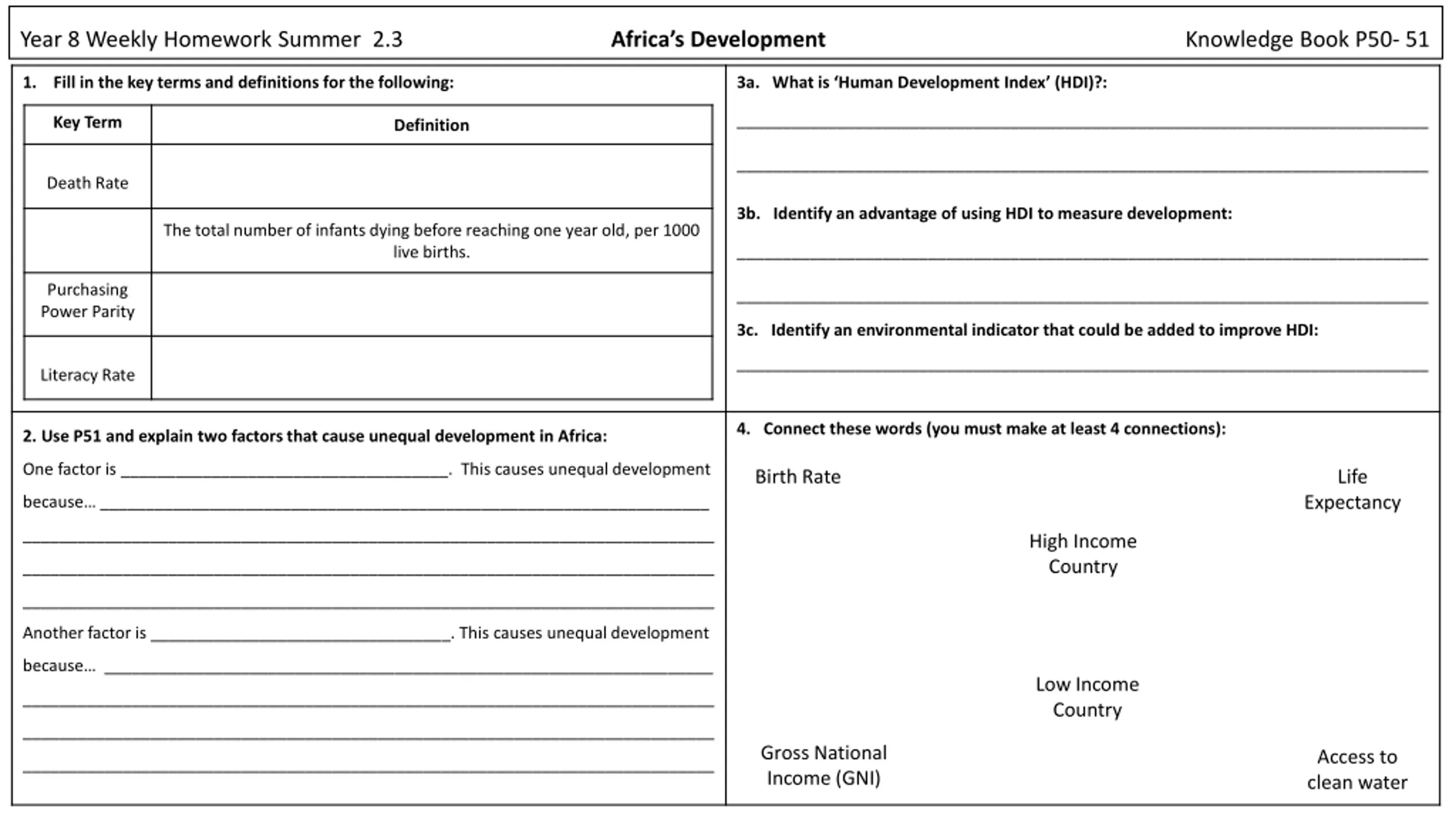 Year 8 Weekly Homework Summer 2.3 Africa s Development Knowledge Book P50- 51 1. Fill in the key terms and definitions for the following: 3a. What is Human Development Index (HDI)?: ____________________________________________________________________________ Key Term Definition ____________________________________________________________________________ Death Rate 3b. Identify an advantage of using HDI to measure development: The total number of infants dying before reaching one year old, per 1000 live births. ____________________________________________________________________________ Purchasing Power Parity ____________________________________________________________________________ 3c. Identify an environmental indicator that could be added to improve HDI: ____________________________________________________________________________ Literacy Rate 4. Connect these words (you must make at least 4 connections): 2. Use P51 and explain two factors that cause unequal development in Africa: One factor is ____________________________________. This causes unequal development Birth Rate Life Expectancy because ___________________________________________________________________ ____________________________________________________________________________ High Income Country ____________________________________________________________________________ ____________________________________________________________________________ Another factor is _________________________________. This causes unequal development because ___________________________________________________________________ Low Income Country ____________________________________________________________________________ ____________________________________________________________________________ Gross National Income (GNI) Access to clean water ____________________________________________________________________________