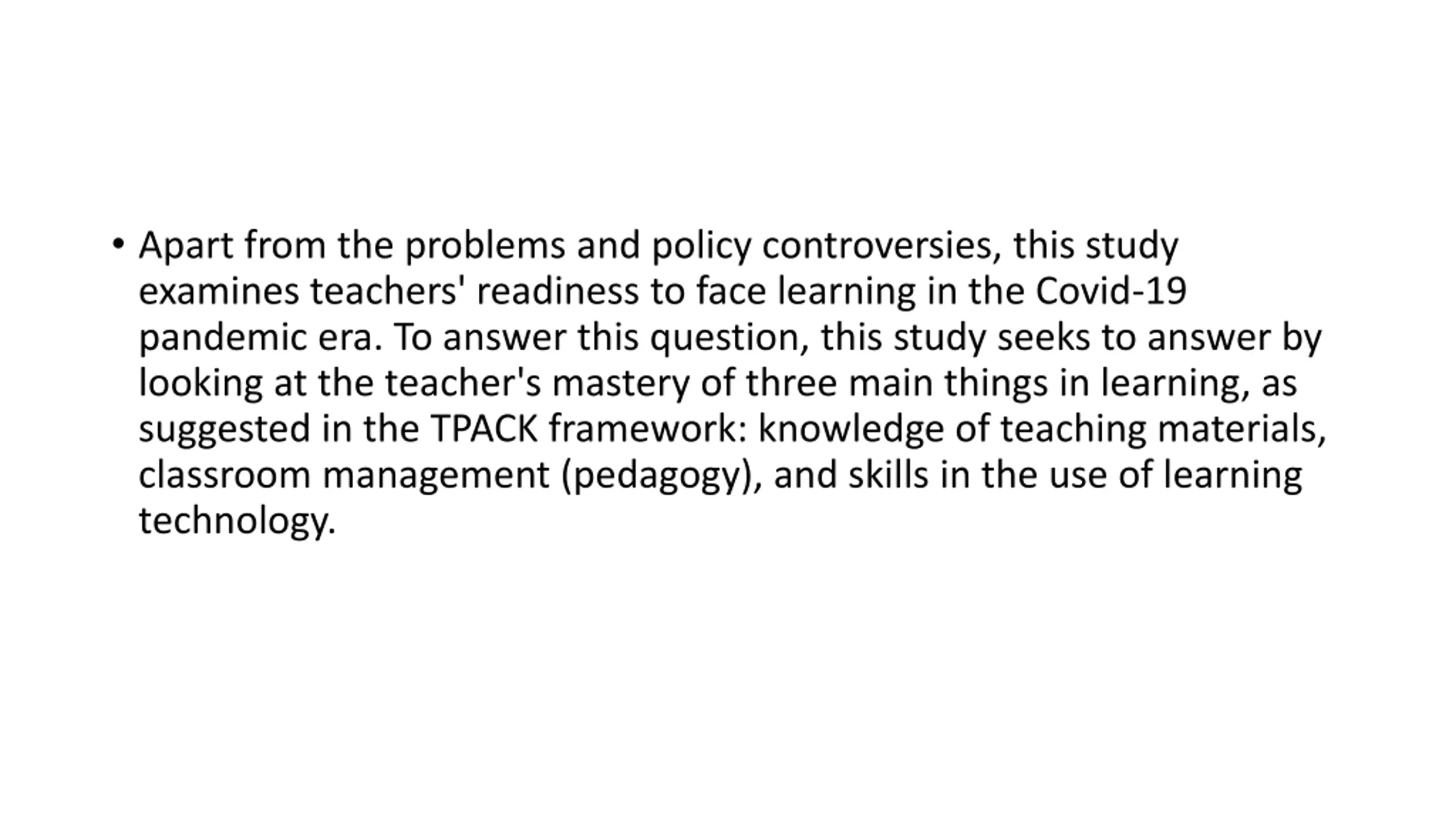 Apart from the problems and policy controversies, this study examines teachers' readiness to face learning in the Covid-19 pandemic era. To answer this question, this study seeks to answer by looking at the teacher's mastery of three main things in learning, as suggested in the TPACK framework: knowledge of teaching materials, classroom management (pedagogy), and skills in the use of learning technology.