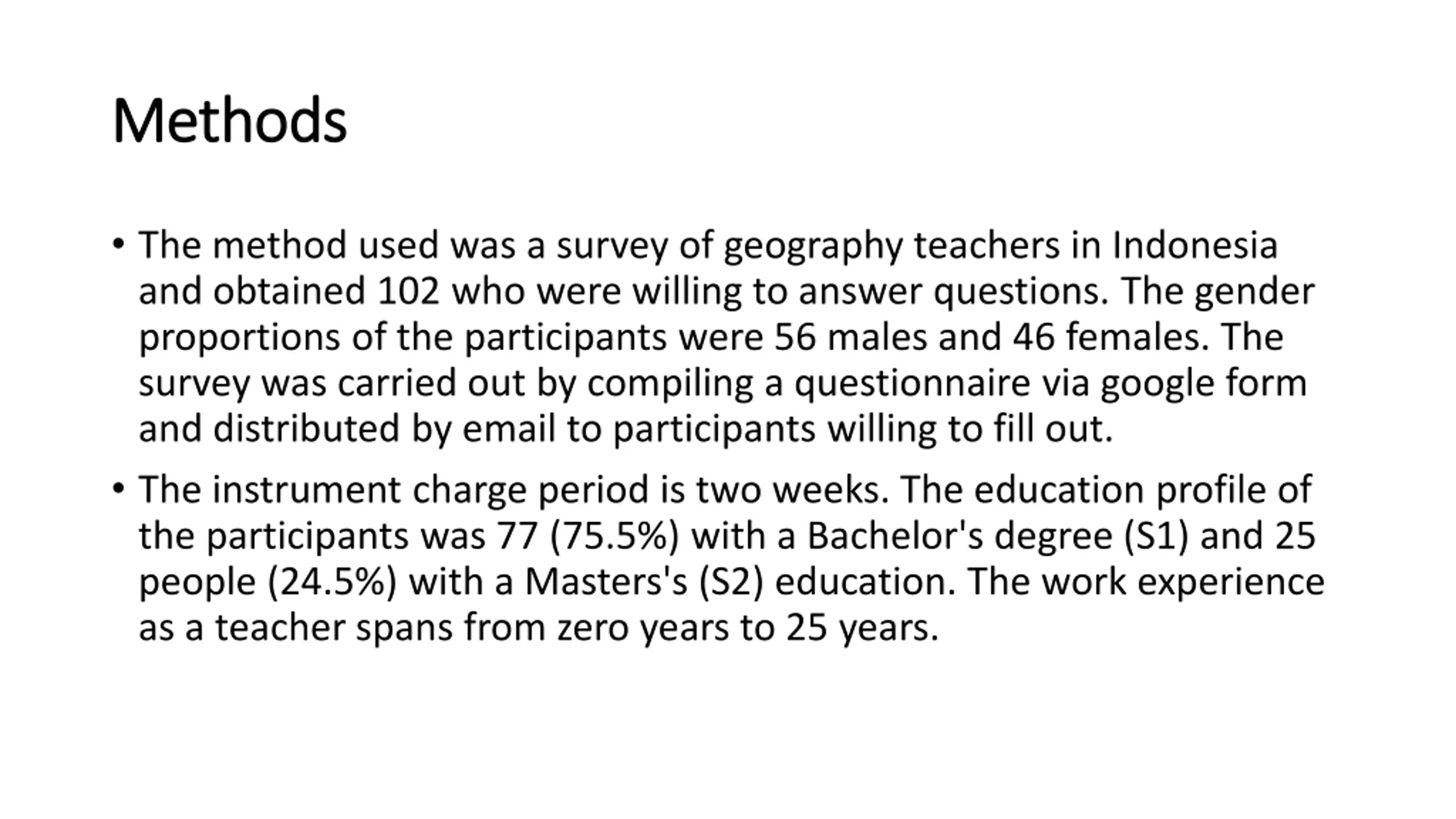 Methods Methods The method used was a survey of geography teachers in Indonesia and obtained 102 who were willing to answer questions. The gender proportions of the participants were 56 males and 46 females. The survey was carried out by compiling a questionnaire via google form and distributed by email to participants willing to fill out. The instrument charge period is two weeks. The education profile of the participants was 77 (75.5%) with a Bachelor's degree (S1) and 25 people (24.5%) with a Masters's (S2) education. The work experience as a teacher spans from zero years to 25 years.