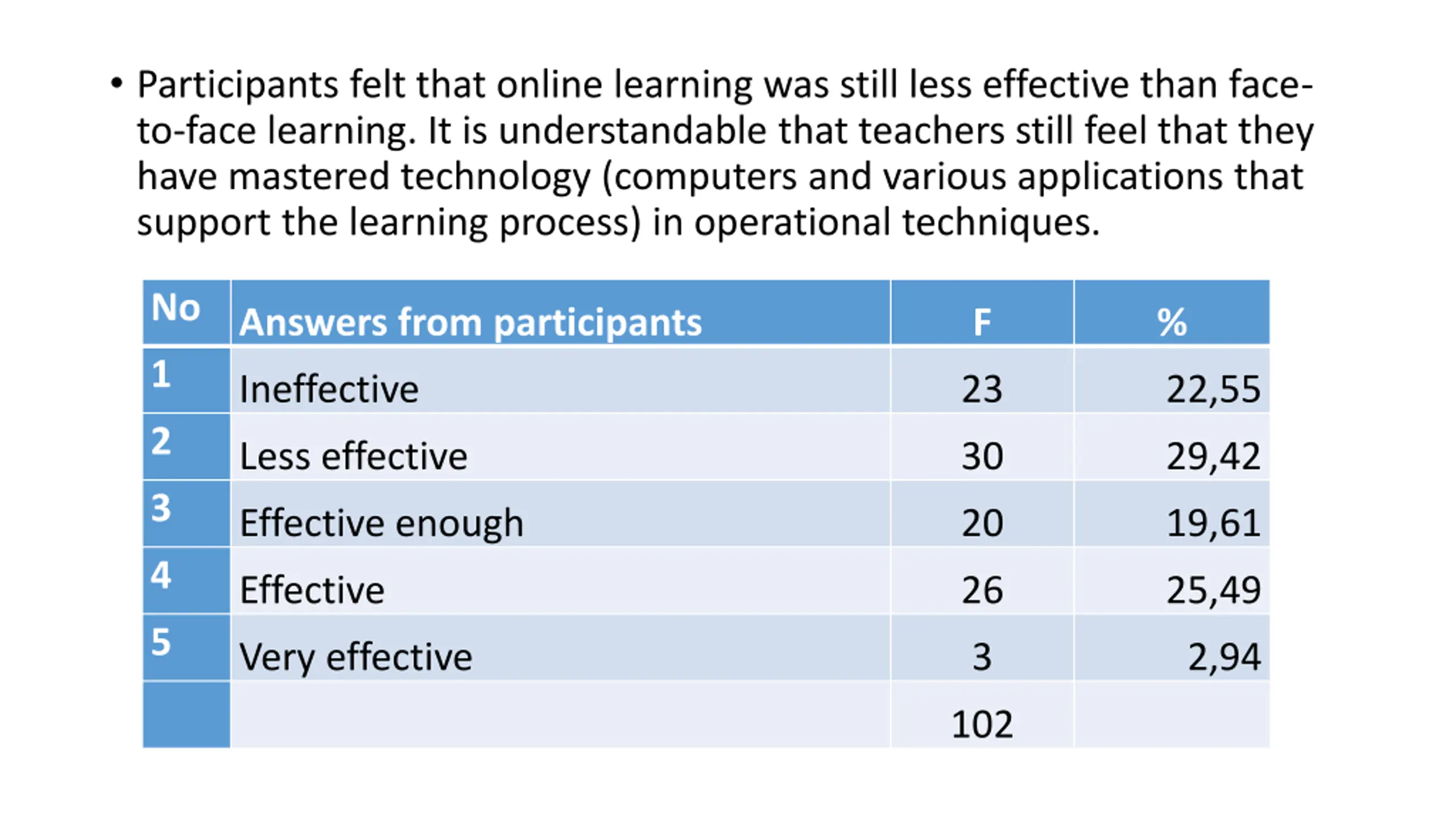 Participants felt that online learning was still less effective than face- to-face learning. It is understandable that teachers still feel that they have mastered technology (computers and various applications that support the learning process) in operational techniques. No Answers from participants F % 1 Ineffective 23 22,55 2 Less effective 30 29,42 3 Effective enough 20 19,61 4 Effective 26 25,49 5 Very effective 3 2,94 102