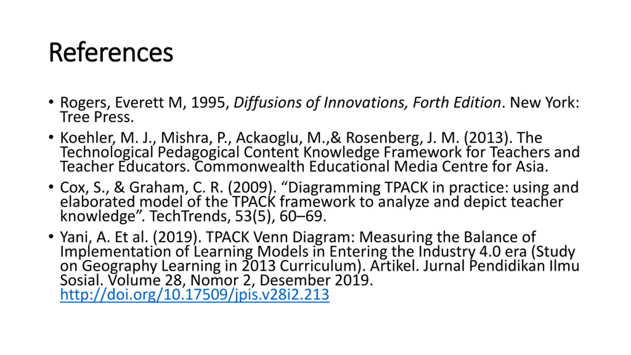 References References Rogers, Everett M, 1995, Diffusions of Innovations, Forth Edition. New York: Tree Press. Koehler, M. J., Mishra, P., Ackaoglu, M.,& Rosenberg, J. M. (2013). The Technological Pedagogical Content Knowledge Framework for Teachers and Teacher Educators. Commonwealth Educational Media Centre for Asia. Cox, S., & Graham, C. R. (2009). Diagramming TPACK in practice: using and elaborated model of the TPACK framework to analyze and depict teacher knowledge . TechTrends, 53(5), 60 69. Yani, A. Et al. (2019). TPACK Venn Diagram: Measuring the Balance of Implementation of Learning Models in Entering the Industry 4.0 era (Study on Geography Learning in 2013 Curriculum). Artikel. Jurnal Pendidikan Ilmu Sosial. Volume 28, Nomor 2, Desember 2019. http://doi.org/10.17509/jpis.v28i2.213