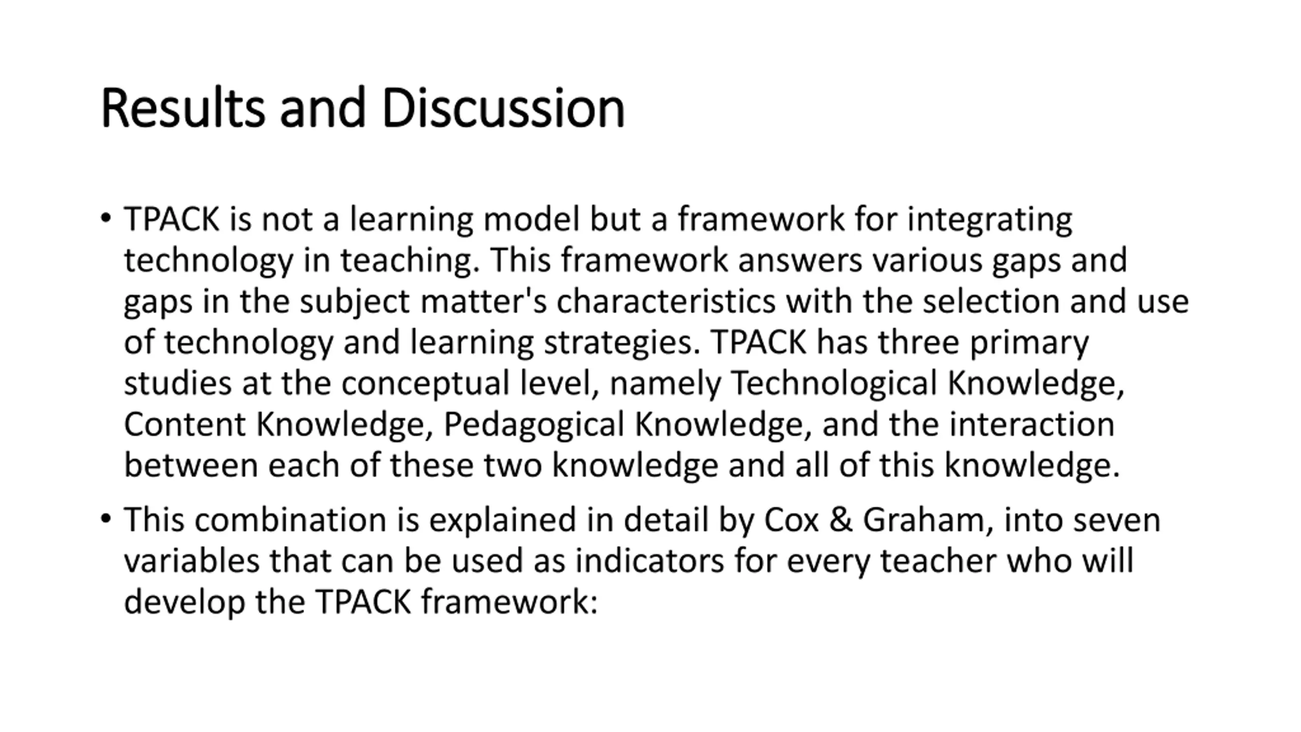 Results and Discussion Results and Discussion TPACK is not a learning model but a framework for integrating technology in teaching. This framework answers various gaps and gaps in the subject matter's characteristics with the selection and use of technology and learning strategies. TPACK has three primary studies at the conceptual level, namely Technological Knowledge, Content Knowledge, Pedagogical Knowledge, and the interaction between each of these two knowledge and all of this knowledge. This combination is explained in detail by Cox & Graham, into seven variables that can be used as indicators for every teacher who will develop the TPACK framework: