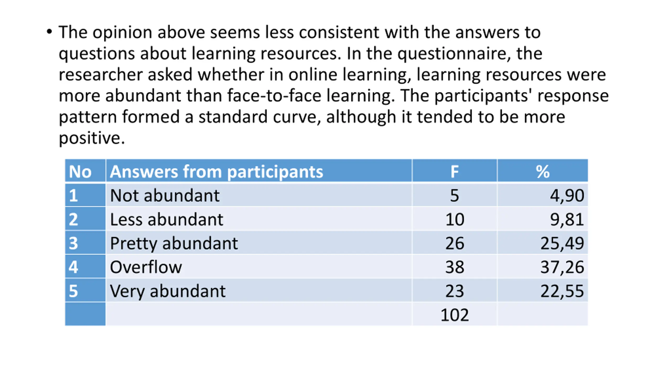 The opinion above seems less consistent with the answers to questions about learning resources. In the questionnaire, the researcher asked whether in online learning, learning resources were more abundant than face-to-face learning. The participants' response pattern formed a standard curve, although it tended to be more positive. No 1 2 3 4 5 Answers from participants Not abundant Less abundant Pretty abundant Overflow Very abundant F 5 10 26 38 23 102 % 4,90 9,81 25,49 37,26 22,55