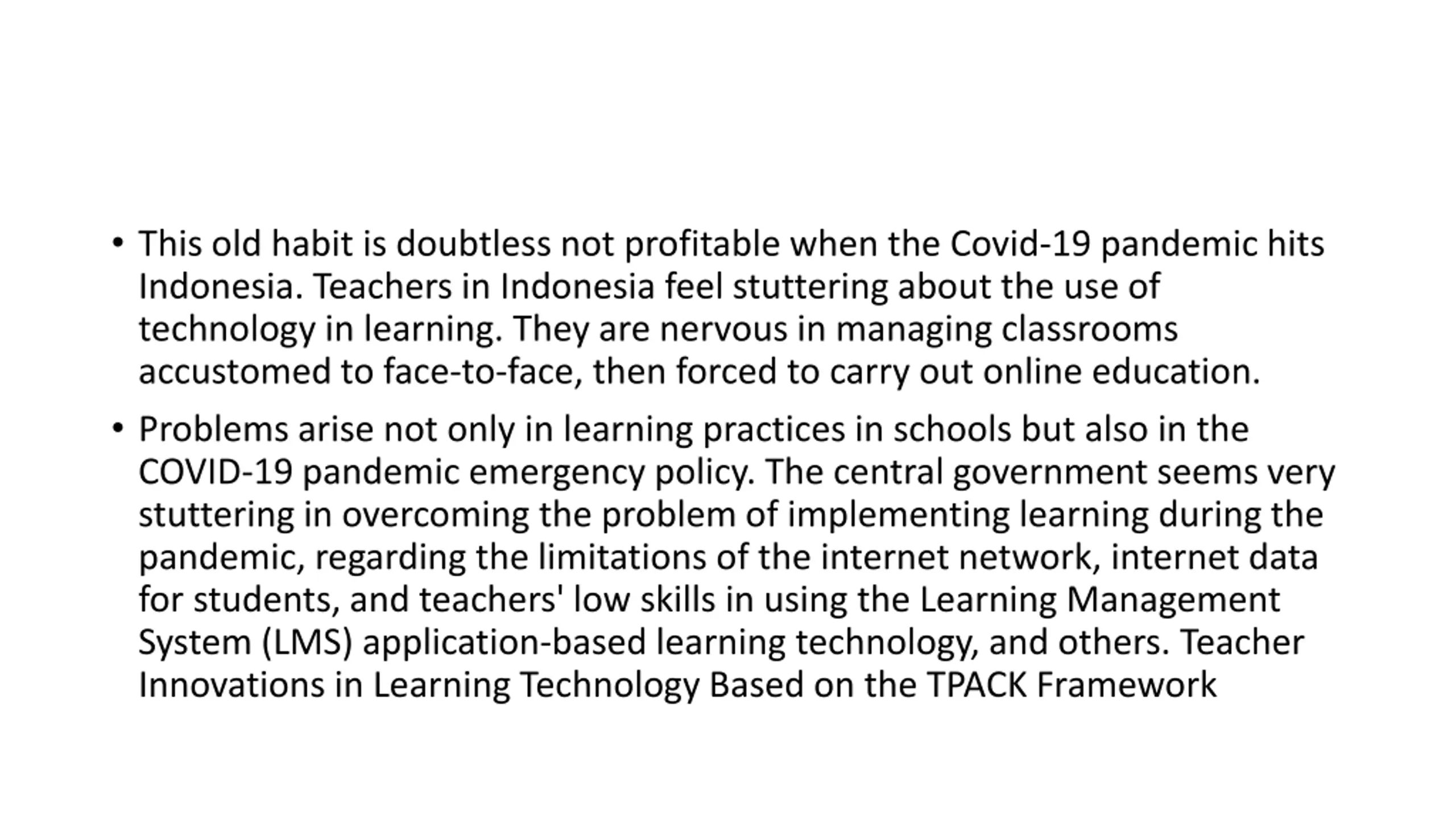 This old habit is doubtless not profitable when the Covid-19 pandemic hits Indonesia. Teachers in Indonesia feel stuttering about the use of technology in learning. They are nervous in managing classrooms accustomed to face-to-face, then forced to carry out online education. Problems arise not only in learning practices in schools but also in the COVID-19 pandemic emergency policy. The central government seems very stuttering in overcoming the problem of implementing learning during the pandemic, regarding the limitations of the internet network, internet data for students, and teachers' low skills in using the Learning Management System (LMS) application-based learning technology, and others. Teacher Innovations in Learning Technology Based on the TPACK Framework