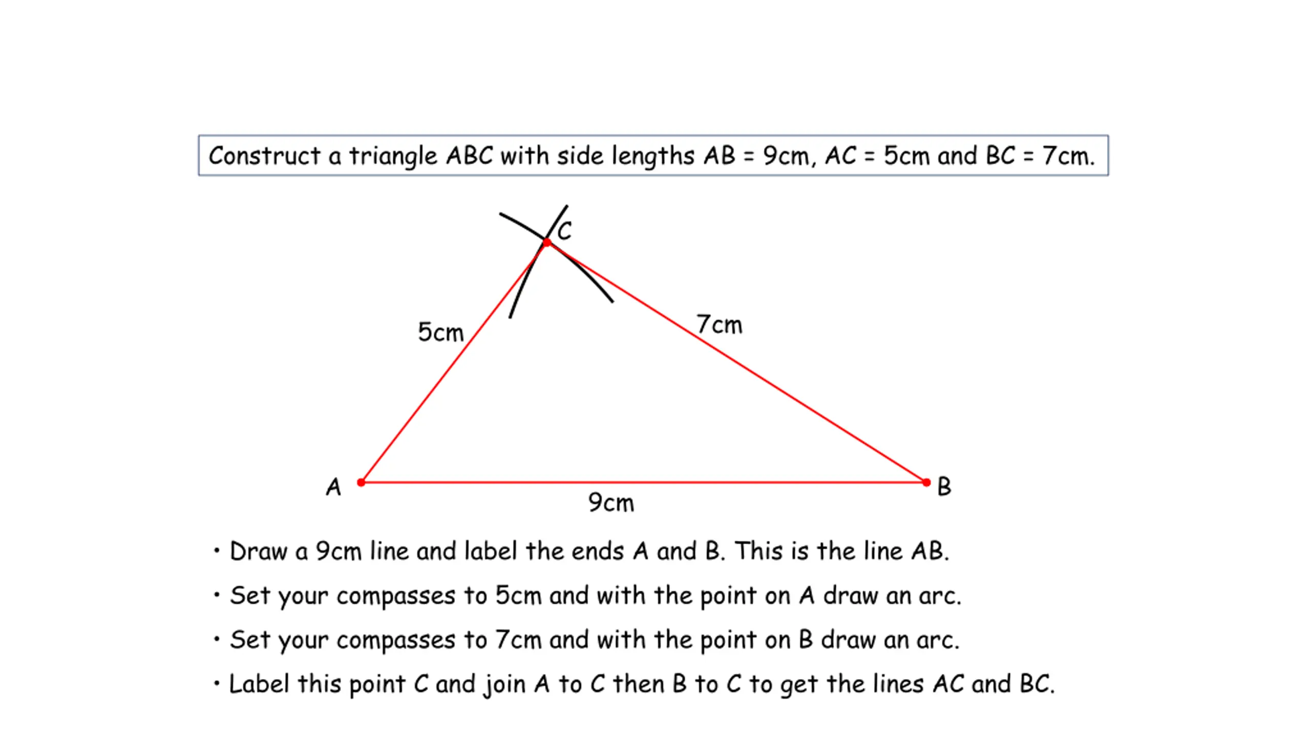 Construct a triangle ABC with side lengths AB = 9cm, AC = 5cm and BC = 7cm. C 7cm 5cm A B 9cm Draw a 9cm line and label the ends A and B. This is the line AB. Set your compasses to 5cm and with the point on A draw an arc. Set your compasses to 7cm and with the point on B draw an arc. Label this point C and join A to C then B to C to get the lines AC and BC.