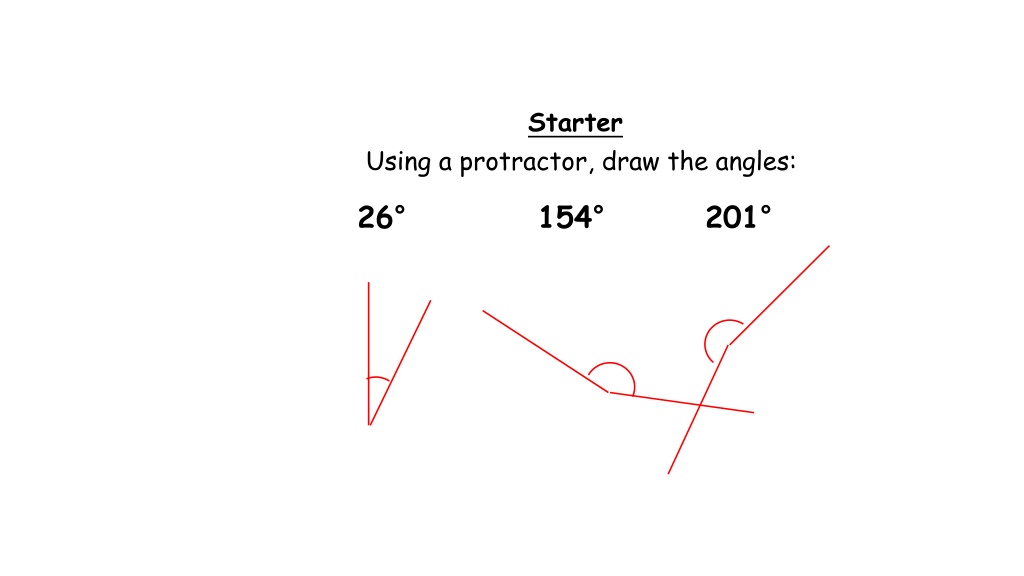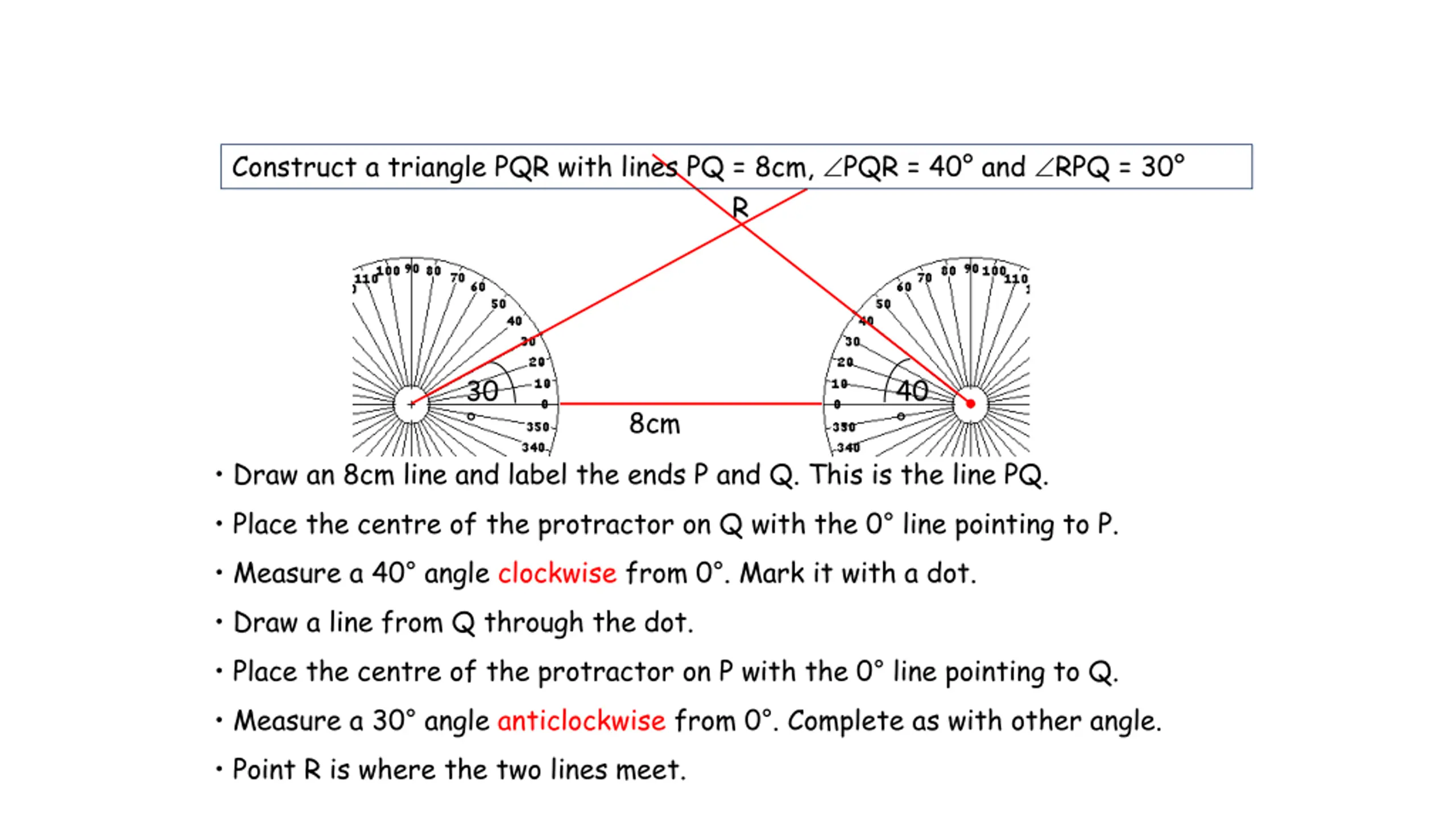Construct a triangle PQR with lines PQ = 8cm, PQR = 40 and RPQ = 30 R . . 30 40 P Q 8cm Draw an 8cm line and label the ends P and Q. This is the line PQ. Place the centre of the protractor on Q with the 0 line pointing to P. Measure a 40 angle clockwise from 0 . Mark it with a dot. Draw a line from Q through the dot. Place the centre of the protractor on P with the 0 line pointing to Q. Measure a 30 angle anticlockwise from 0 . Complete as with other angle. Point R is where the two lines meet.