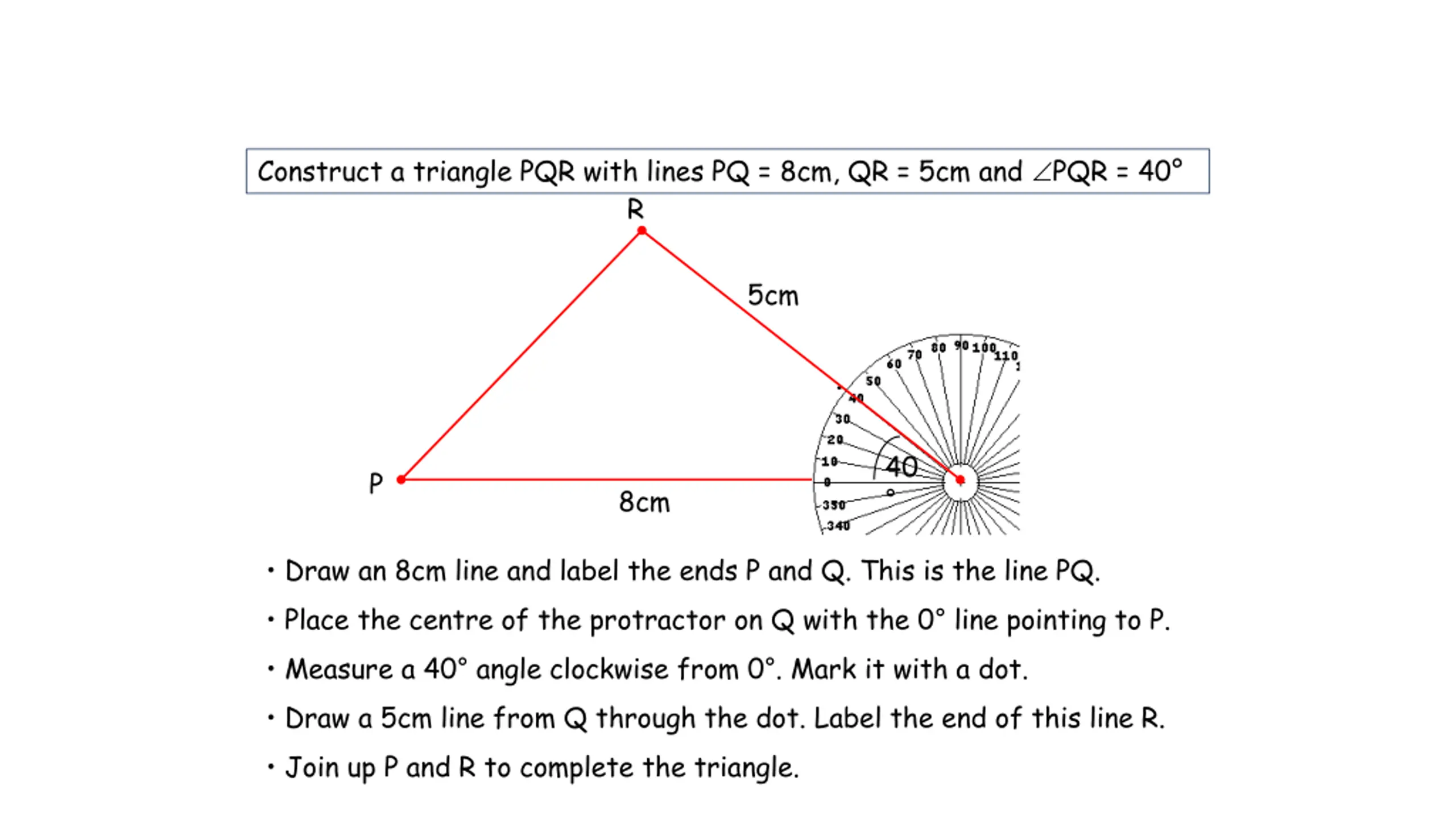Construct a triangle PQR with lines PQ = 8cm, QR = 5cm and PQR = 40 R 5cm . 40 P Q 8cm Draw an 8cm line and label the ends P and Q. This is the line PQ. Place the centre of the protractor on Q with the 0 line pointing to P. Measure a 40 angle clockwise from 0 . Mark it with a dot. Draw a 5cm line from Q through the dot. Label the end of this line R. Join up P and R to complete the triangle.